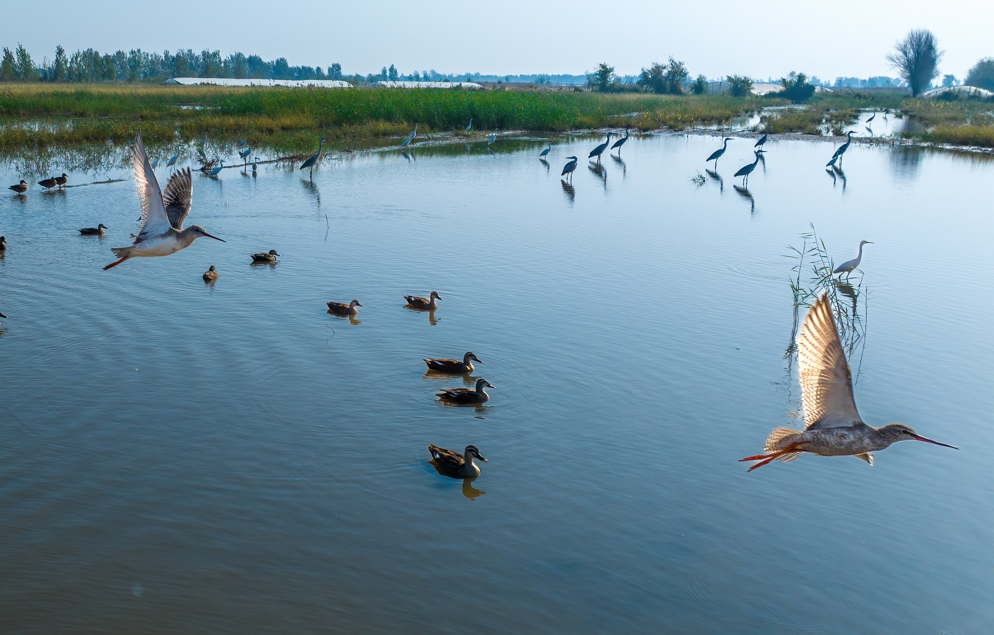 8日上午9时许,衡水湖荷花园南侧湖畔,一池残荷点缀着澄澈的湖面,只见莲蓬低垂着头,枯叶临水照镜,静谧又优雅,远远望去犹如一幅生态水墨画。湖面深处则是一幅动态美图,数十只红嘴鸥、白骨顶鸡相互追逐、觅食玩耍,鸣叫声不绝于耳。远处岸边的枯草丛内,几只苍鹭的身影时隐时现。它们如哨兵般警觉,一旦听到异响,立刻昂首高鸣,一忽儿振翅高飞,翱翔于天际之中,待一阵盘旋过后,又复落于湖面之上。视线再往远处移去,潋滟的湖面与苍蓝的天空逐渐化为一色,成群的大雁点缀其中,不时变幻着队形,给这幅美图增添了几许灵动。