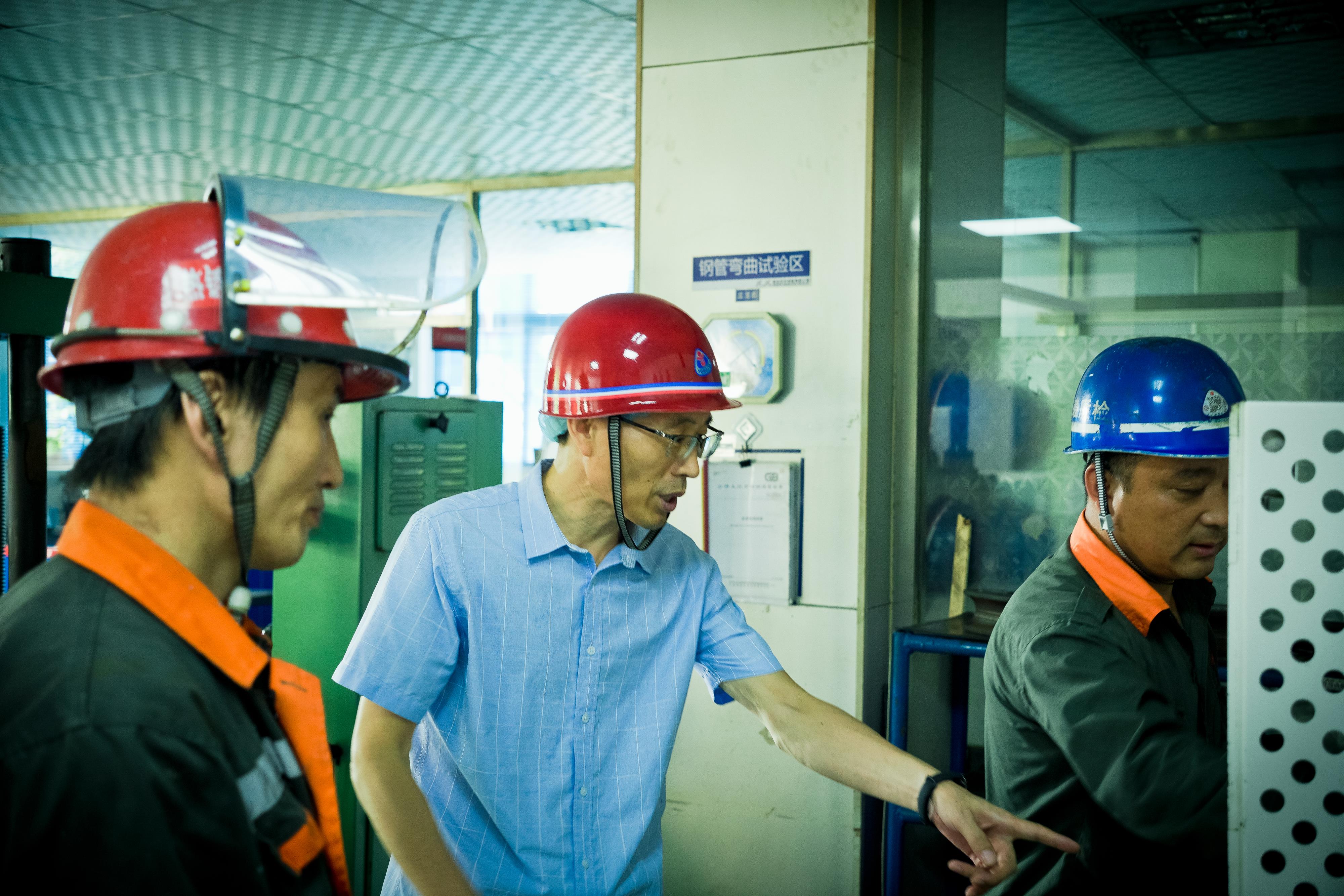 河北省突出贡献技师、河北省技能大师工作室领办人邢贵宁在京华制管有限公司生产一线进行技术指导。