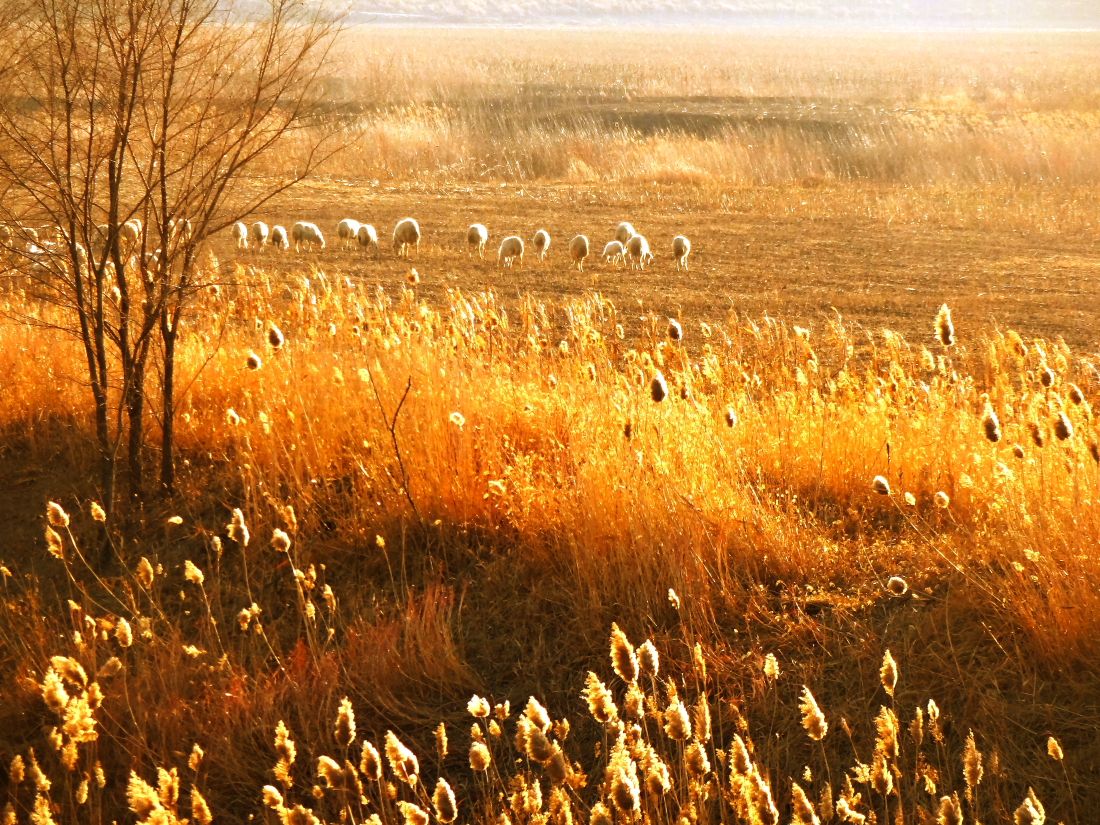 羊们也应该是通人性的吧。每当夕阳西下,我这个小主人在路边翘首看着羊儿们归来的方向,羊群渐走渐近,急急地向我飞奔而来,一下子围绕在我的身边,有的冲我仰头咩咩地叫几声,好像在跟我打招呼,有的过来蹭蹭我的腿,痒痒的、暖暖的,有一种很微妙的幸福。