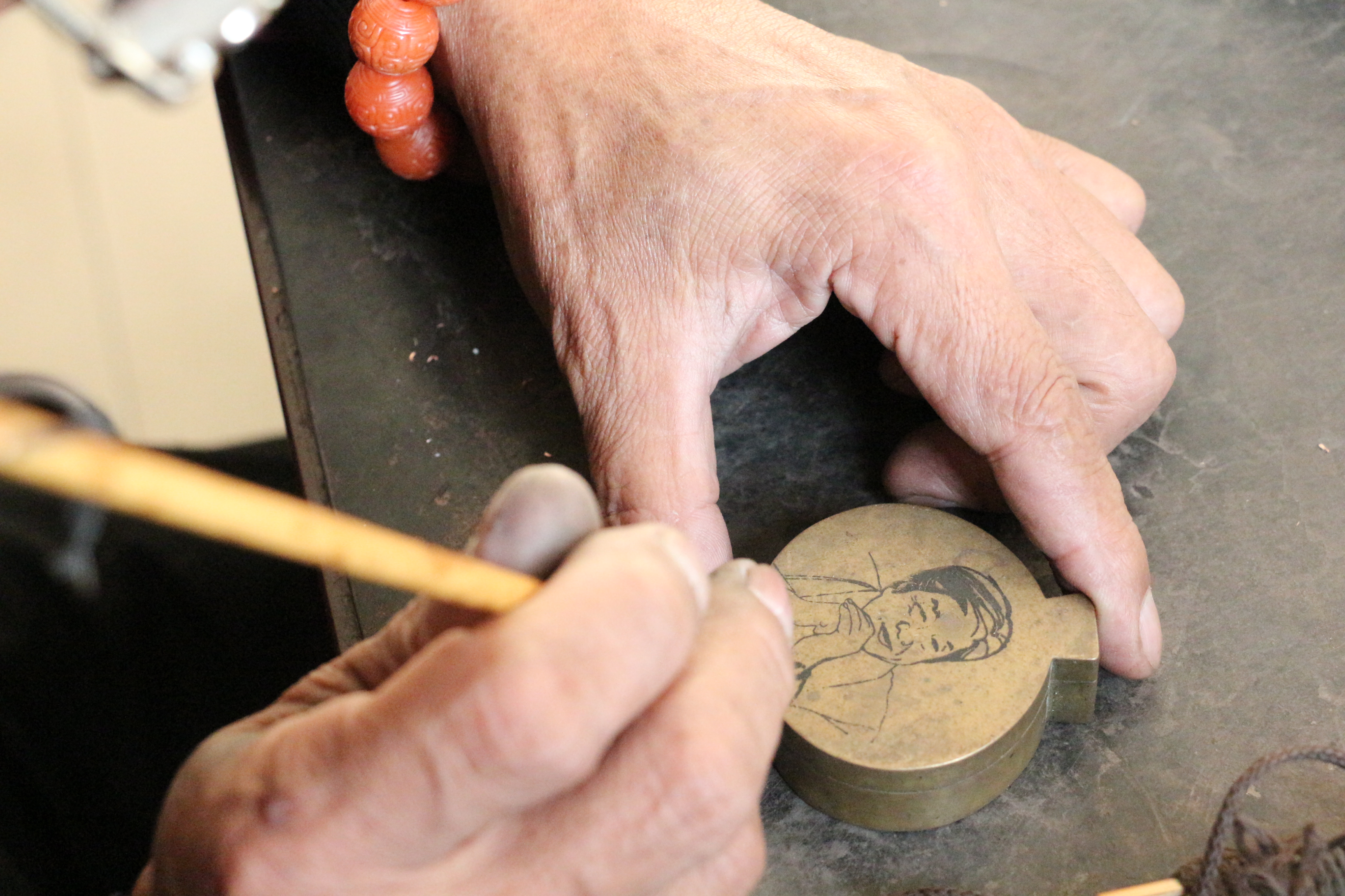 刻铜是刻铜艺人用钢刀,在铜质的文房用具上镌刻书画的艺术。刻者以刀代笔,在铜面上镌刻出一幅幅具有强烈金石韵味的书画作品。正是在刻制当中产生的那种独特的刀痕,使画面线条的金石韵味更加强烈,使其比纸上的作品更具“视觉冲击力”。