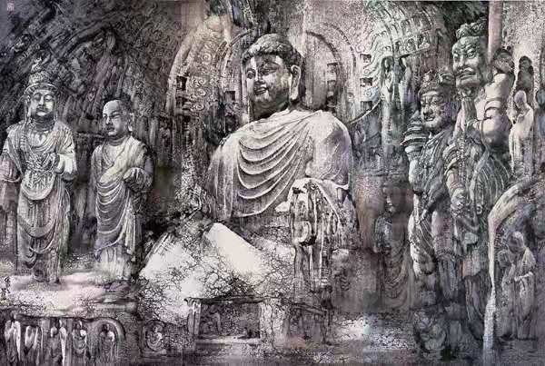 2010年夏天,我到洛阳栾川写生创作。有人对我讲起了龙门石窟申报世界文化遗产十周年,洛阳举办庆祝活动,在全国各地邀来不少名家去画龙门石窟,结果都未能创作出理想的画作,最后只搞了一个摄影作品展,主办方想邀我去画龙门石窟。石窟造型有它的独特性,用传统中国绘画方法的确很难表现,特别是画千年风吹日晒造成的石纹龟裂和斑斑苔藓的痕迹,需用到一些新的特殊技法。在我之前,尚无专画石窟的妙招。于是答应回北京后试一试。