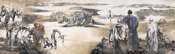 一位非常要好的朋友祖籍洛阳偃师,距离玄奘故里不远。在我们朝夕相处的日子里,他常会念叨起希望我能画唐玄奘的期盼。这毕竟是一项大工程,所以头脑里虽然常会有些画面细节的构思,但几年过去,终未能动笔。