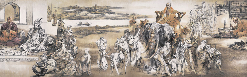 当国家“一带一路”倡议提出后,为我早已成竹在胸的《玄奘圣迹图》又加了一把激情燃烧的火焰,于是我一气呵成,画了这幅高1.85米、长100米的《玄奘圣迹图》。而《西游记八十一条屏》是十年前的作品。这三大系列作品的创作过程前后历时十余年,并不是一朝一夕创作完成的。