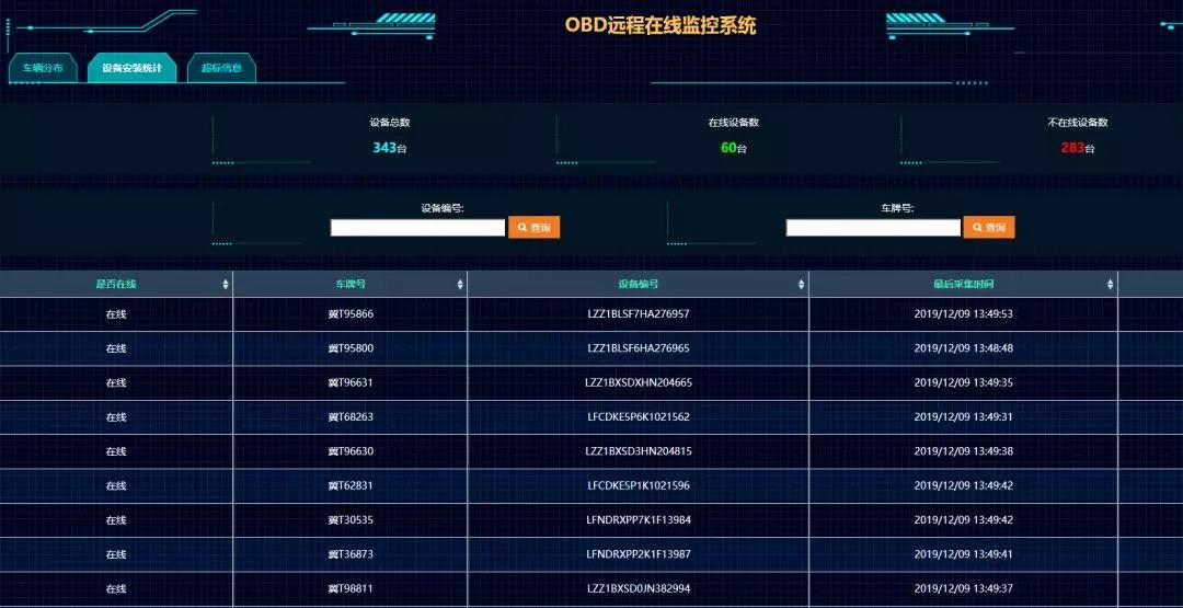 搭建“天地车人”一体化监控平台,加装车载OBD终端在线监控设备,监控重型柴油车NOx实时排放浓度,定位和收集重型柴油车位置信息、运行信息,对重要物流通道上的重型柴油车排放进行实时监控,建立全市移动源动态排放清单,识别重型柴油车重要物流通道,识别路网中排放热点路段及区域,为执法及管控提供数据支撑,现已在全市安装343台OBD在线设备。