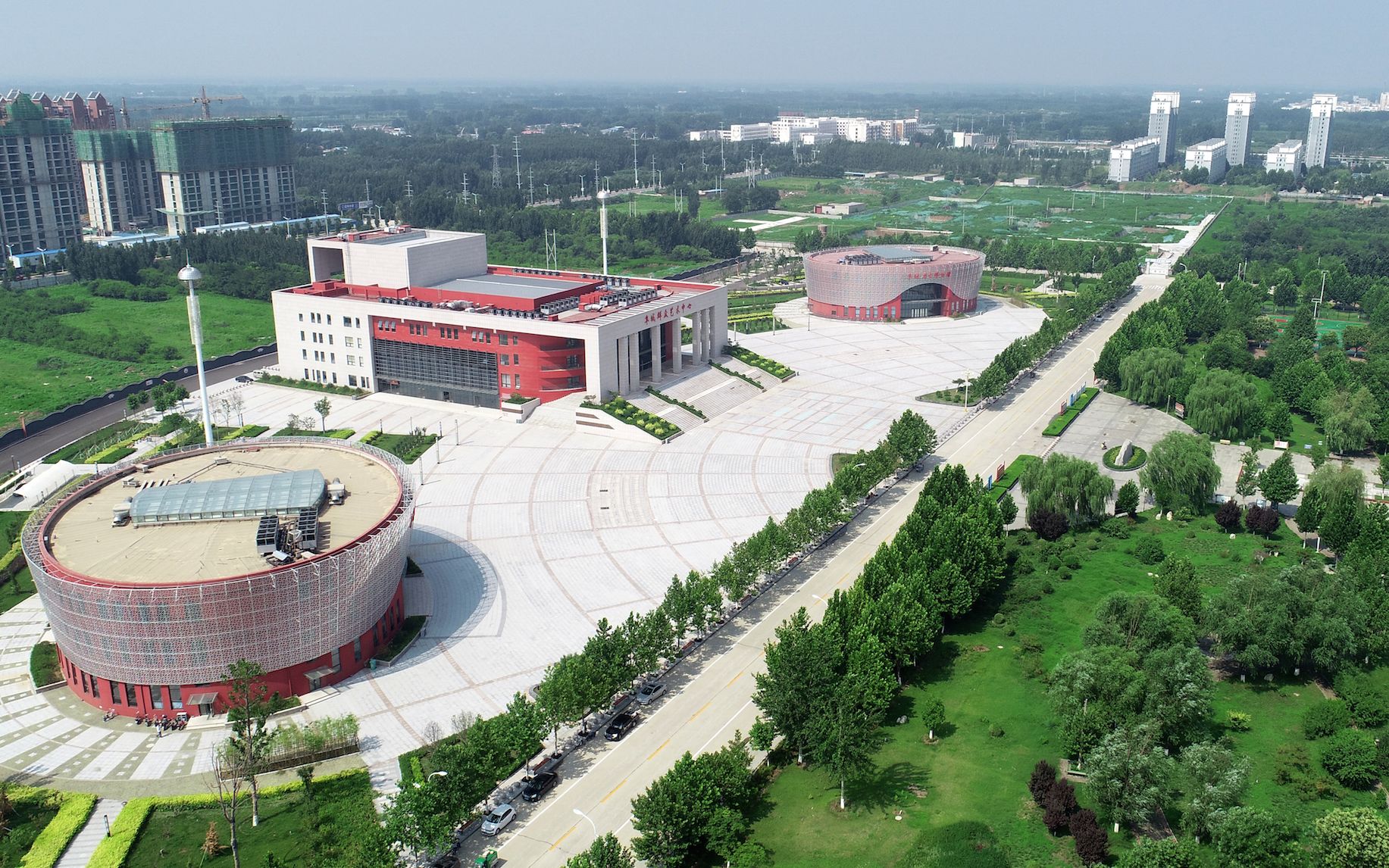 近年来,阜城县高度重视经济与文化的协同发展,把文化提升作为推进新时代经济强县、美丽阜城建设的主体战略之一,兴建的“四馆一中心”(群众文化艺术中心、历史博物馆、规划展览馆、科技馆、剪纸博物馆),带动全县公共文化基础设施提档升级。外观呈方形的群众艺术中心居中,圆形的规划展览馆和其他三馆分居东西两侧,红色的主体建筑,外罩白漆钢架,整个馆群造型美观大气,富有现代气息,成为城市文化的新地标。图为“四馆一中心”航拍图。