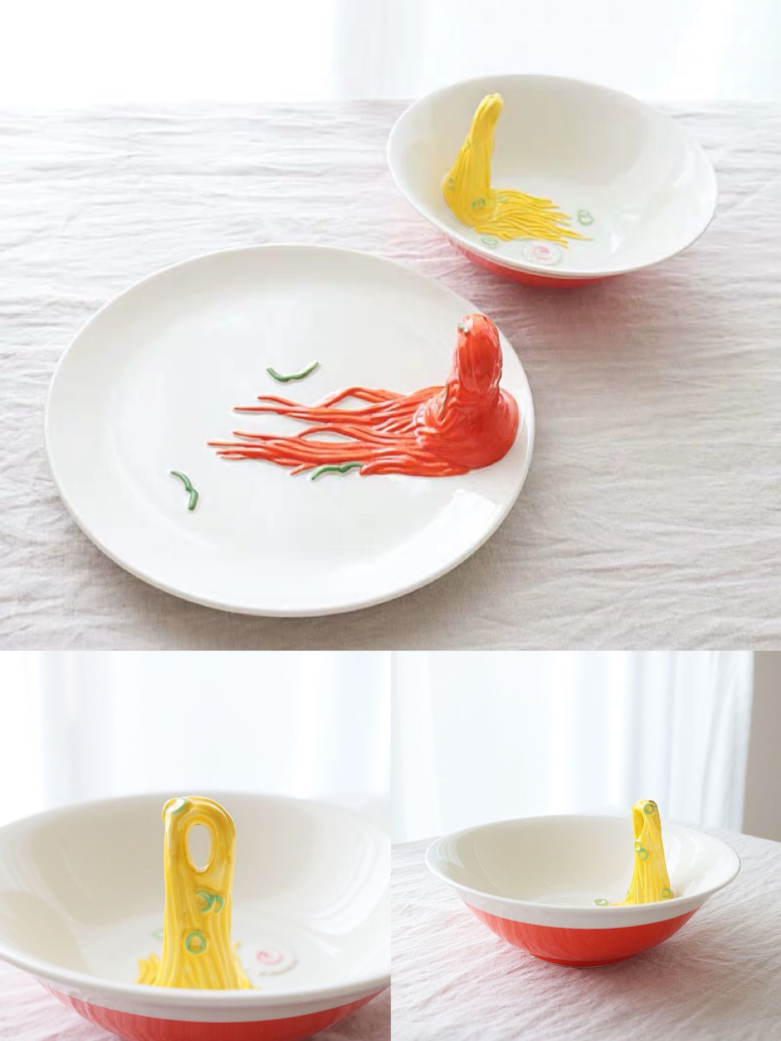 这款餐盘确实是脑洞大开,立体的拉面和意大利面就是被筷子和叉子挑起的样子,既是装饰,也可以用来放置餐具。