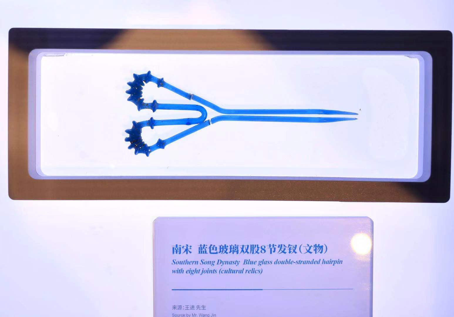 玻璃制品展区,展出的南宋文物玻璃发钗。