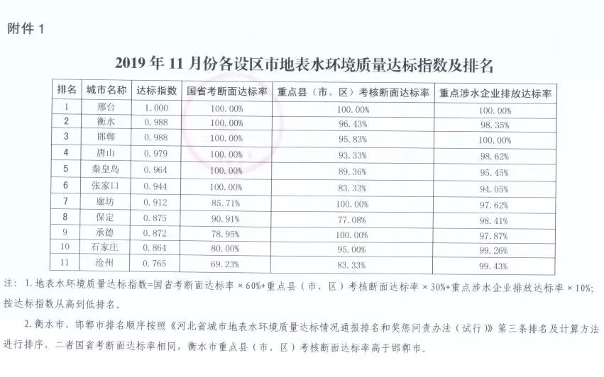 根据《河北省城市地表水环境质量达标情况通报排名和奖惩问责办法(试行)》,近日,省水污染防治工作领导小组办公室通报了2019年11月全省地表水环境质量达标情况排名,对排名前三位的邢台市、衡水市、邯郸市进行奖励,对排名后三位的沧州市、石家庄市、承德市扣减资金。