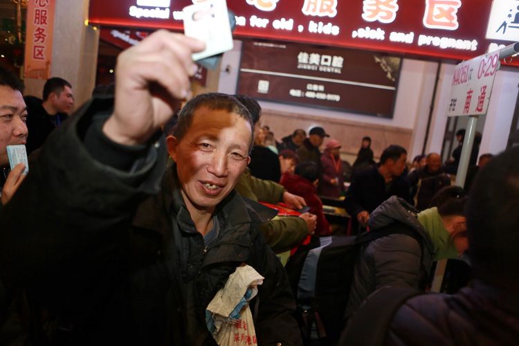 1月9日深夜,北京站检票口,搭乘春运首趟临客的旅客高举身份证,准备踏上回家旅程。