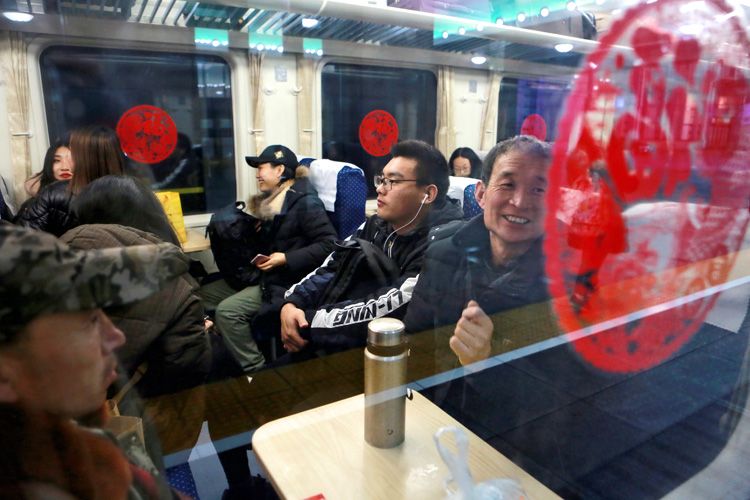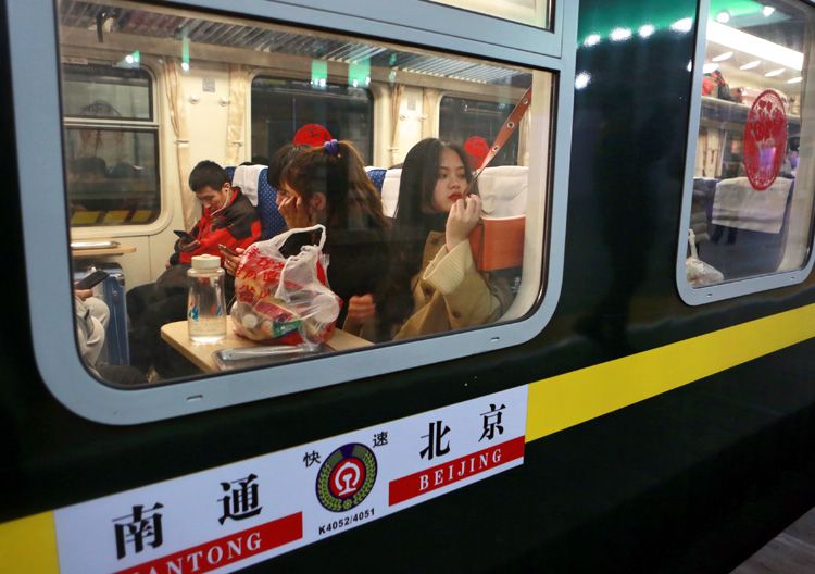 1月10日零时许,在春运首趟增开的北京——南通K4051次列车上,人们等待列车发车。