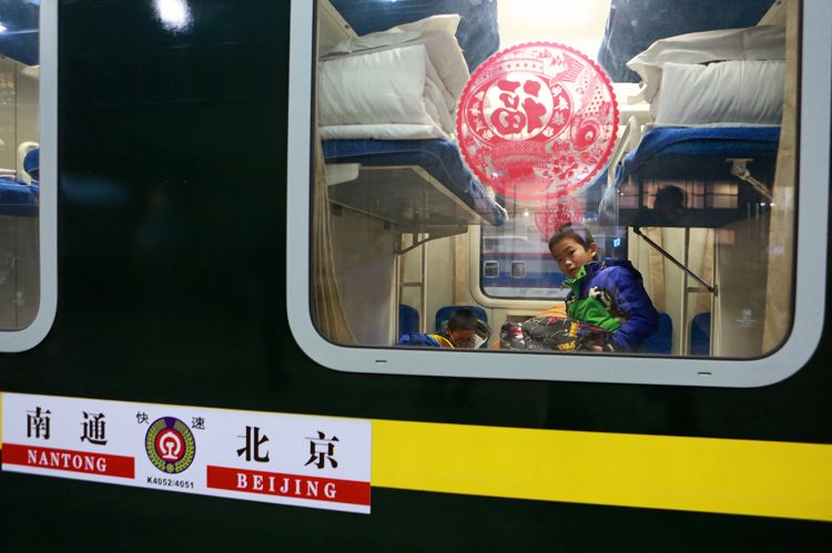 1月10日零时许,在春运首趟增开的北京——南通K4051次列车上,窗户上贴着红红的窗花。