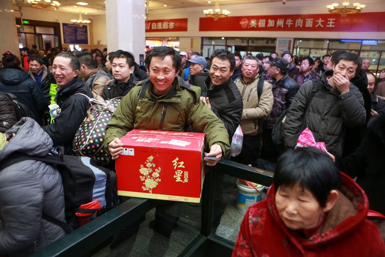 1月9日深夜,北京站候车室,一位旅客怀抱北京特产红星二锅头当做年货。