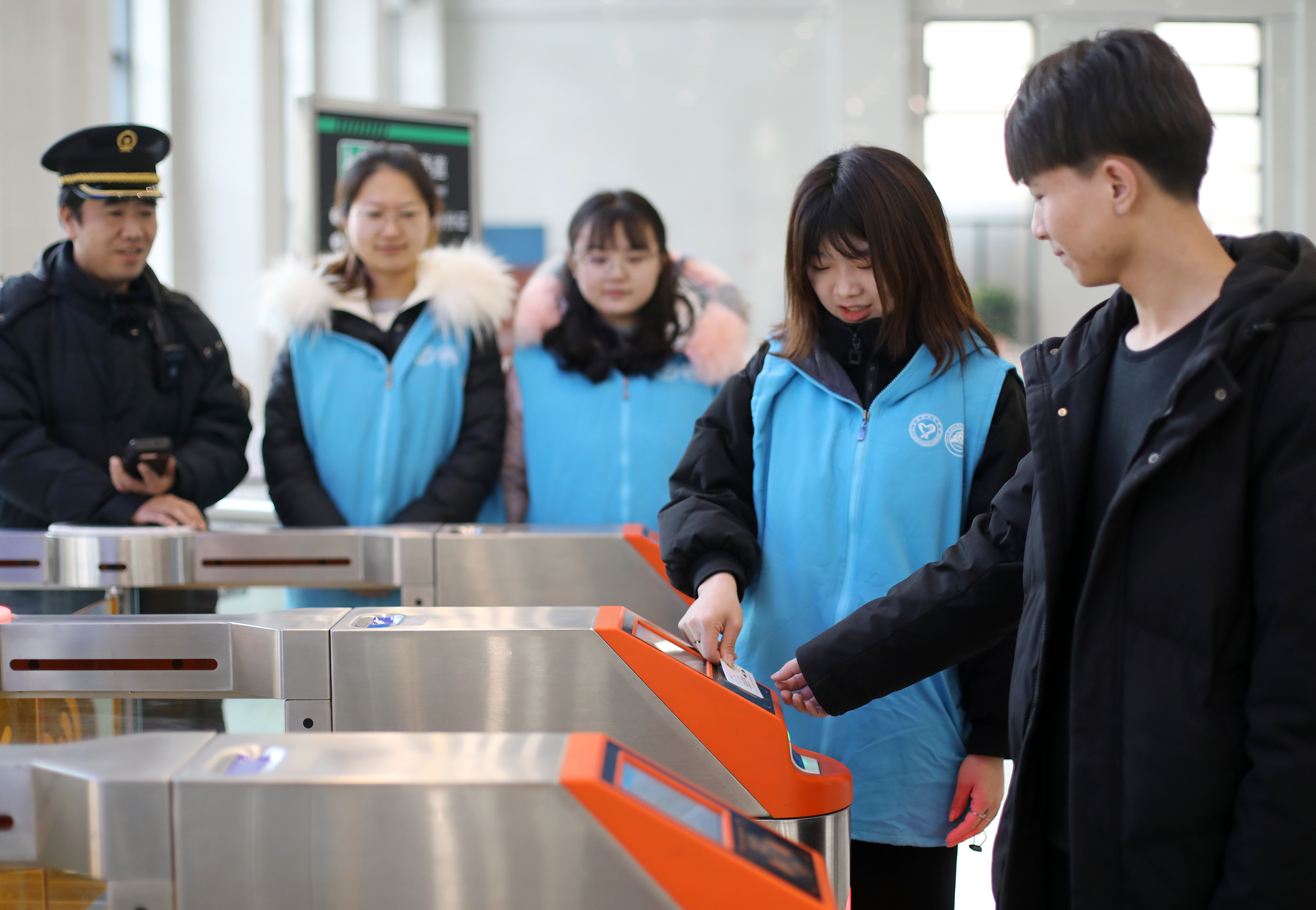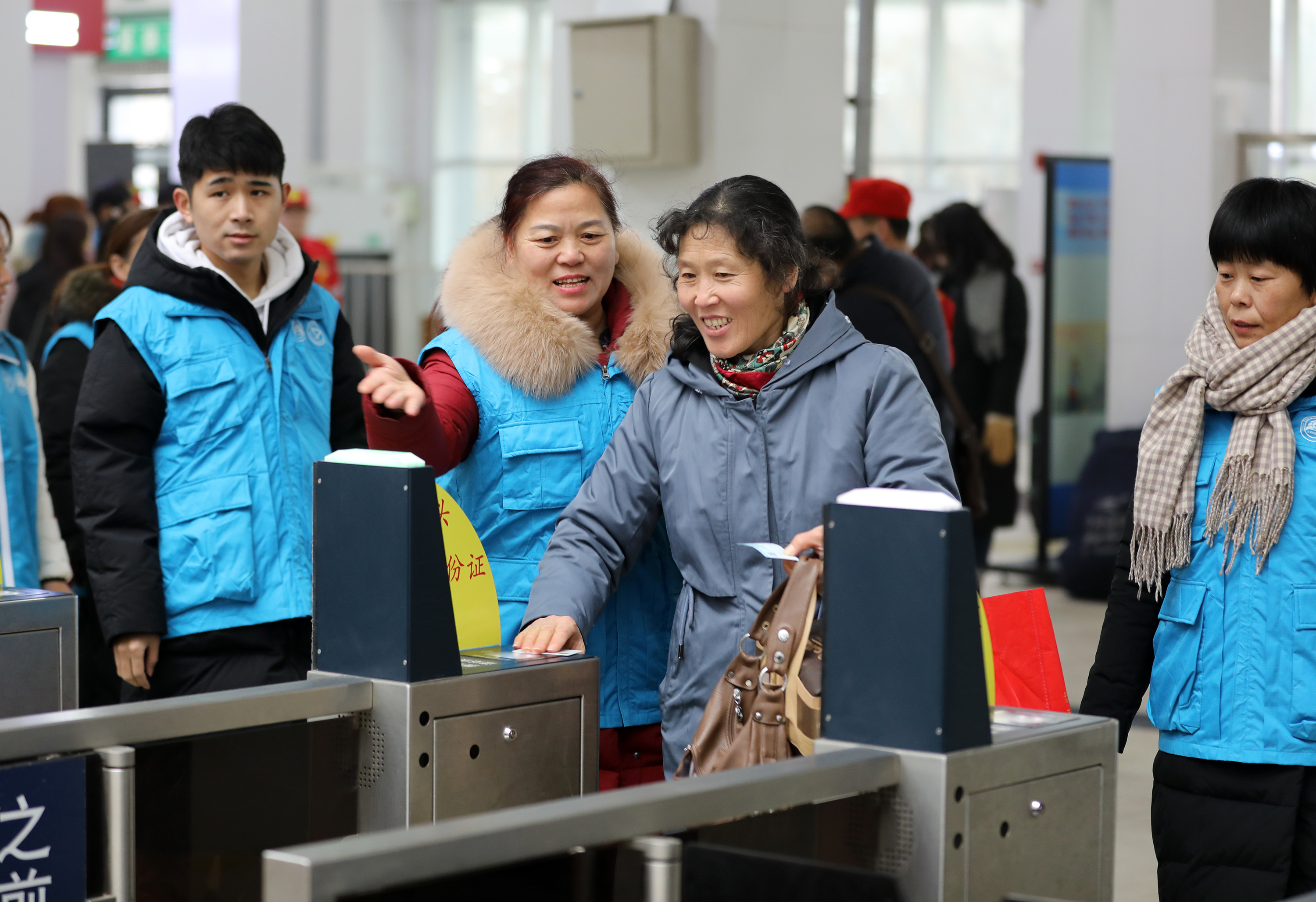 1月10日,衡水火车站旅客在志愿者帮助下扫描身份证进站。