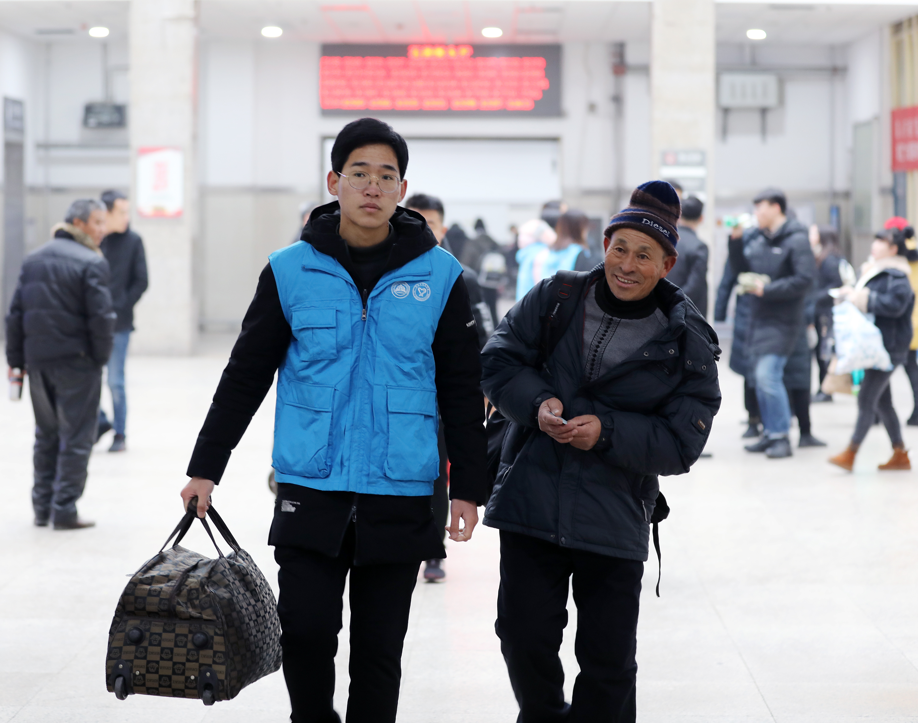 1月10日,衡水火车站旅客在志愿者帮助下到候车室等车。