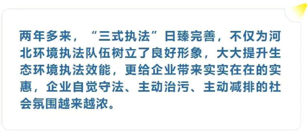 就如何看待环境执法,衡水市宝力工程装备股份有限公司副总经理田志,对环境执法人员同样有着开放、欢迎的心态。“我们是全国行业内第一家实现硫化机密闭的企业,是他们主动逐环节逐管道研究分析,帮着完成的。”这些全部源于河北省生态环境系统的“三式执法”理念。那么到底啥是“三式执法”?让我们一起来看一下。