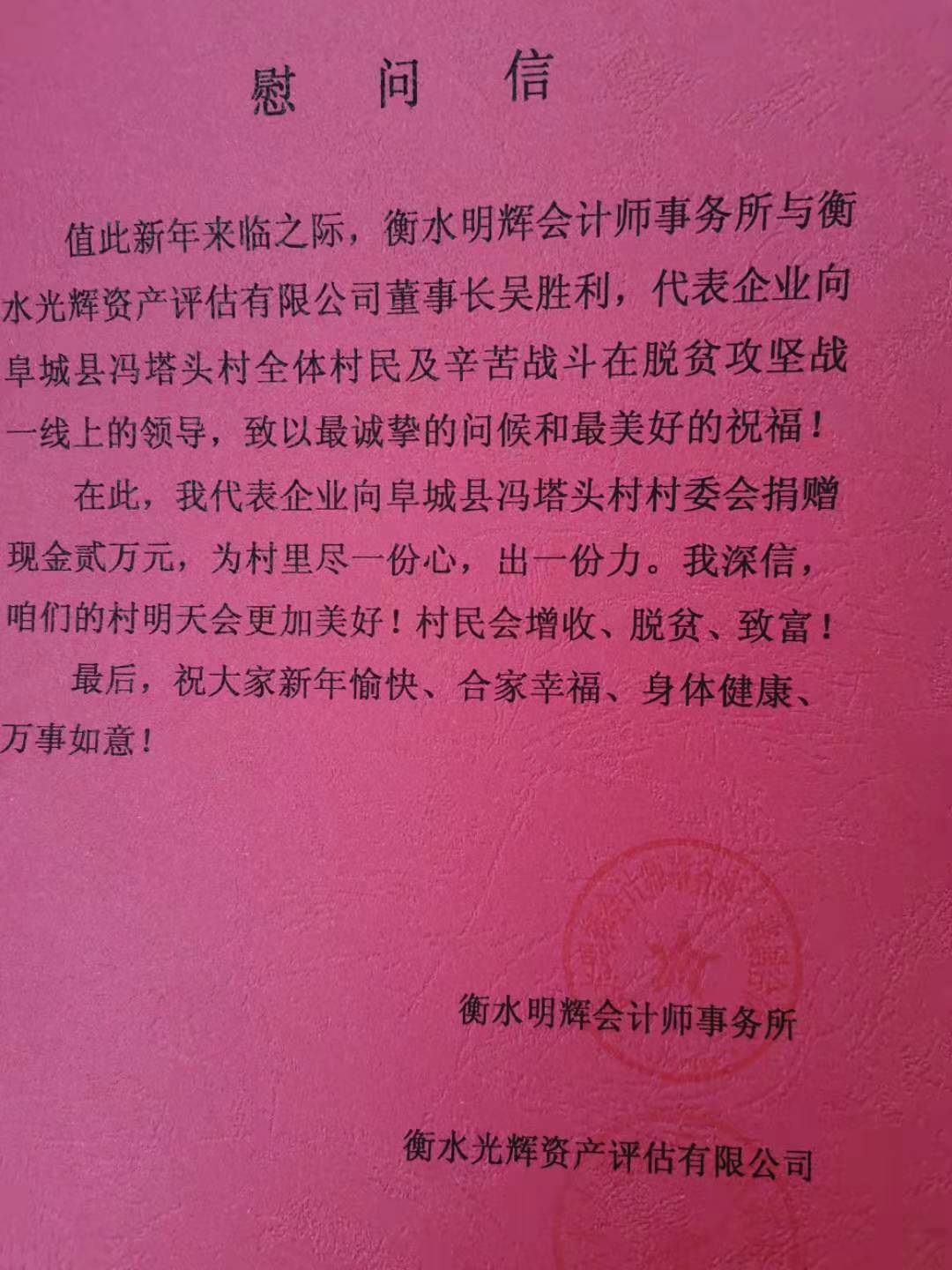 近日,衡水市阜城县阜城镇冯塔头村党支部书记冯国跃将写有“情系家乡,大爱无疆”的锦旗交到了衡水明辉会计师事务所与衡水光辉资产评估有限公司董事长吴胜利手中,感谢他对家乡脱贫振兴的资助。