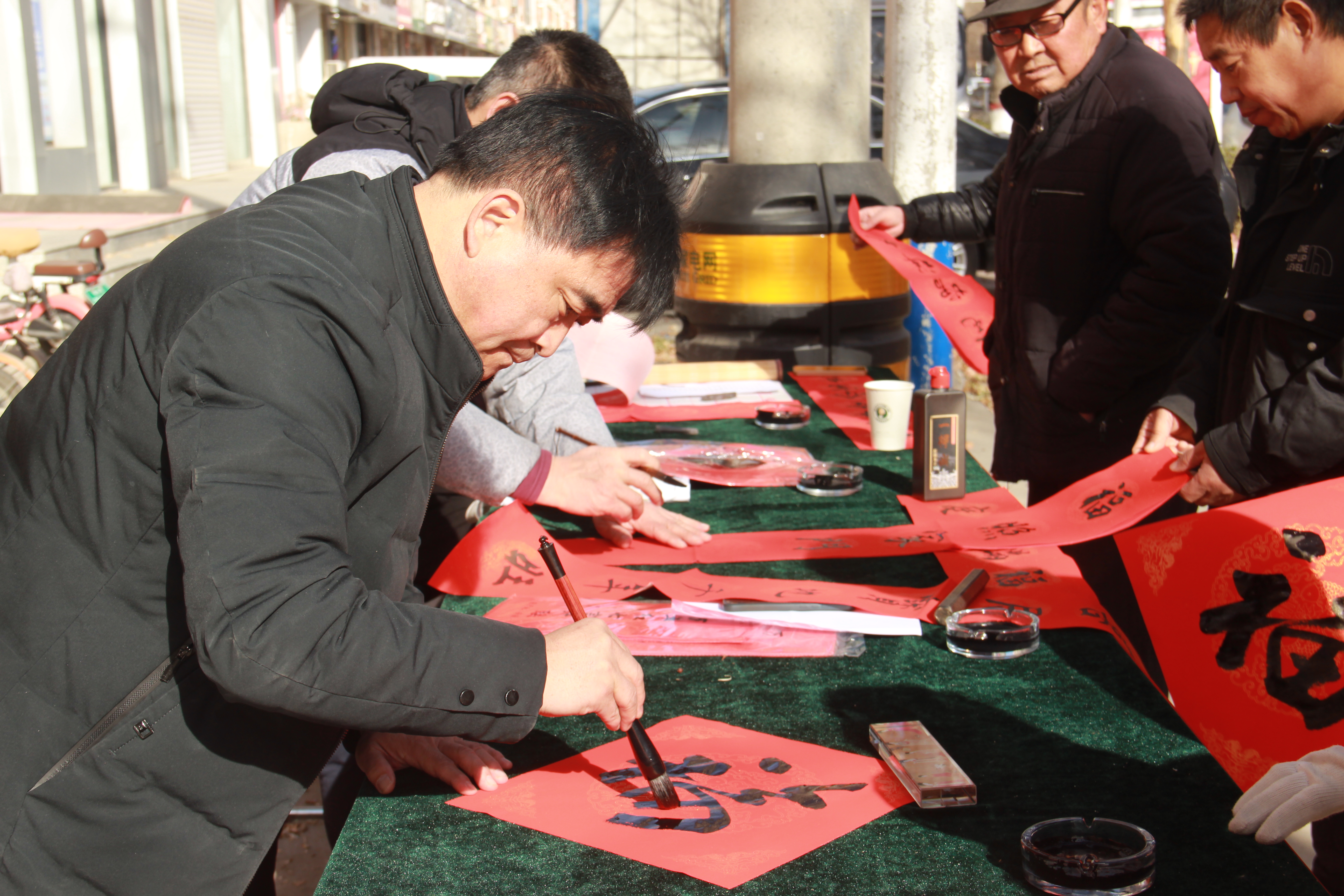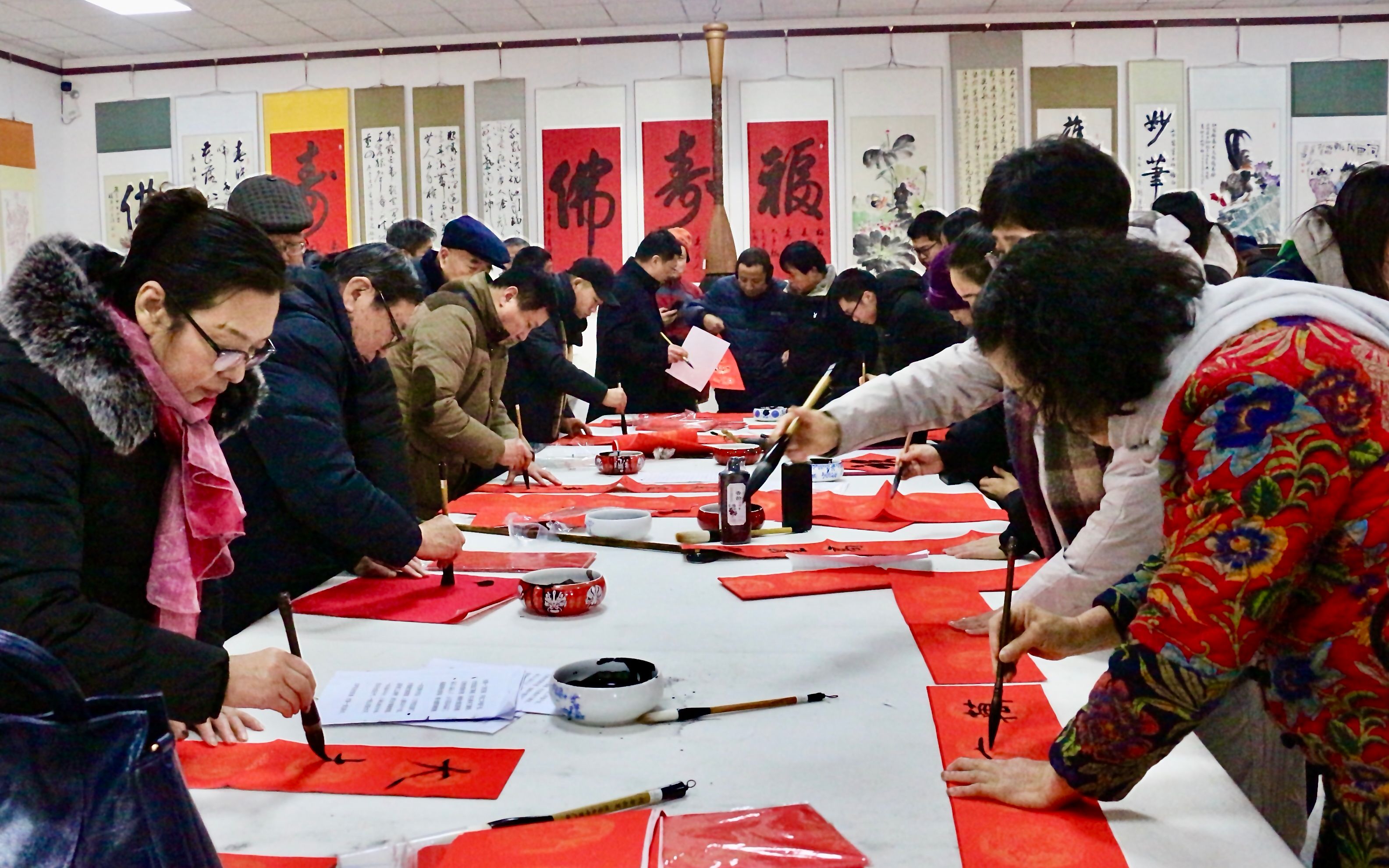 这天是侯店大集,侯店村周围20多个村的村民前来赶集,大街上摩肩接踵,熙熙攘攘。“咚咚咚、锵锵锵”,王文申毛笔厂门口的锣鼓队敲锣打鼓,吸引来众多村民。大家听说,毛笔厂大厅里聚集着众多书法家,在义务写春联,都高兴地进去观看。大厅里,尹海金、杜长荣、张书琴、吴来峰、薛明君等30位书法家伏案挥笔,书写“福”字和对联,写完便有人将其小心翼翼地铺展在地上、桌上晾干。“喜居宝地千年旺 福照家门万事兴”“春临玉宇繁花艳 福到门厅喜气盈”“创大业年年得意 展宏图事事顺心”等一幅幅饱含新春祝福与良好祝愿的对联,令村民们连连赞叹。大家观赏着、挑选着,将各自喜爱的对联、“福”取走。有的甚至等不及晾干就将对联带回了家。