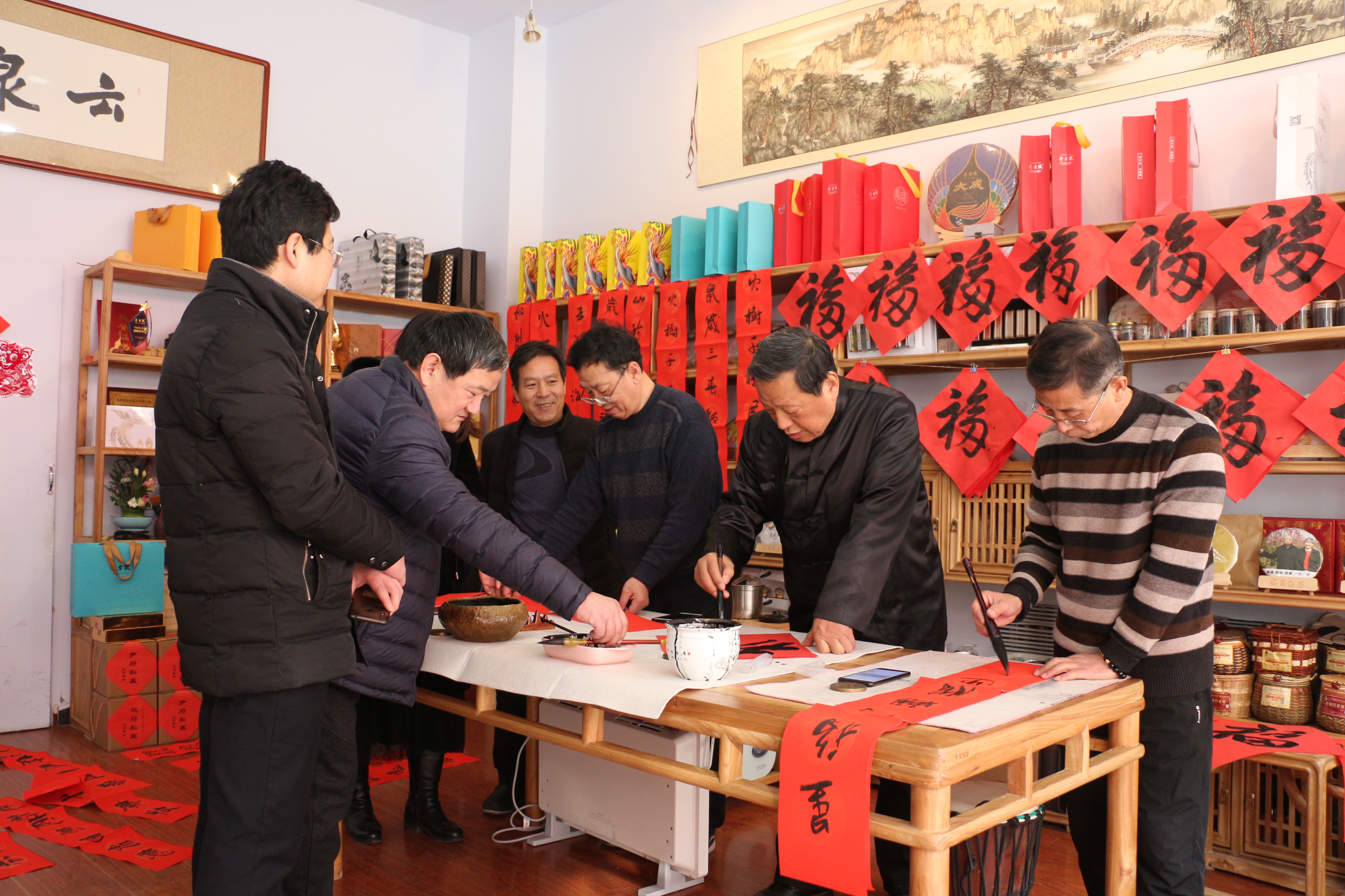 书法家们尽情地挥毫泼墨。一句句寓意吉祥的新春祝福跃然纸上,一副副翰墨飘香的春联作品展现在大家眼前,赢得群众们连连称赞。