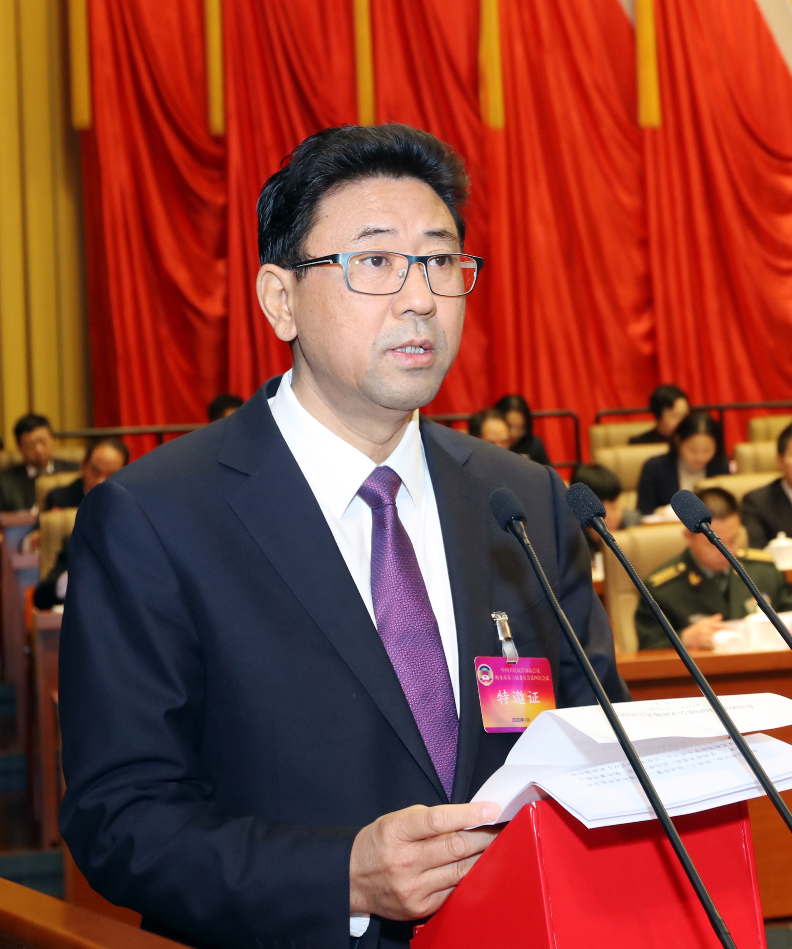 衡水会堂内,灯光璀璨,气氛热烈。主席台正中悬挂着象征各族人民大团结的政协会徽,在十面红旗的映衬下熠熠生辉。会场内高高悬挂着大红条幅:以习近平新时代中国特色社会主义思想为指导,开拓创新,拼搏竞进,奋力谱写经济强市、美丽衡水新篇章!