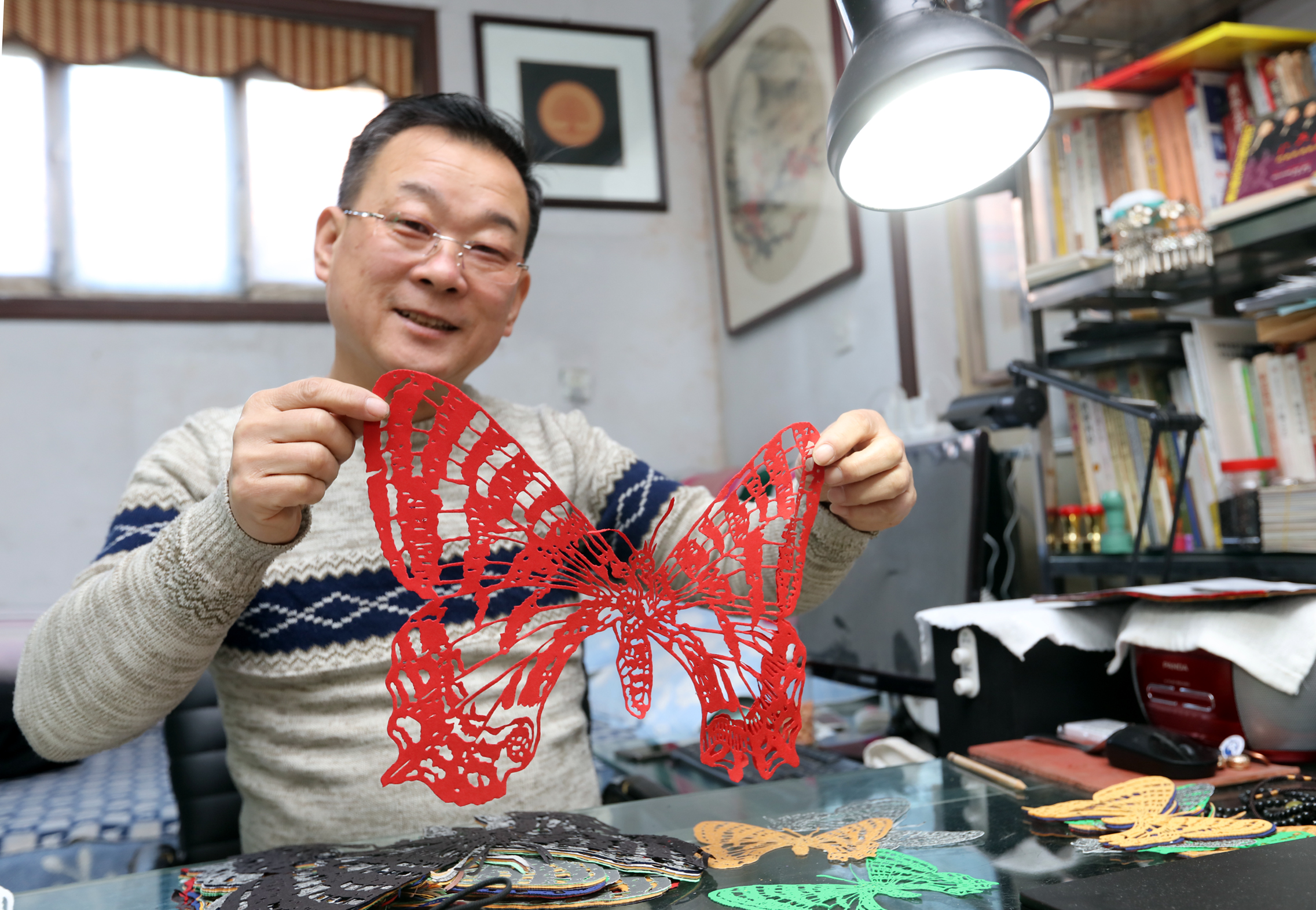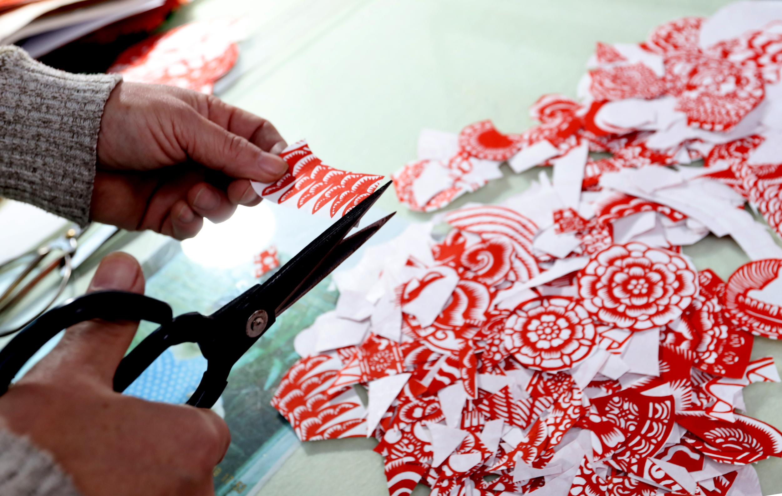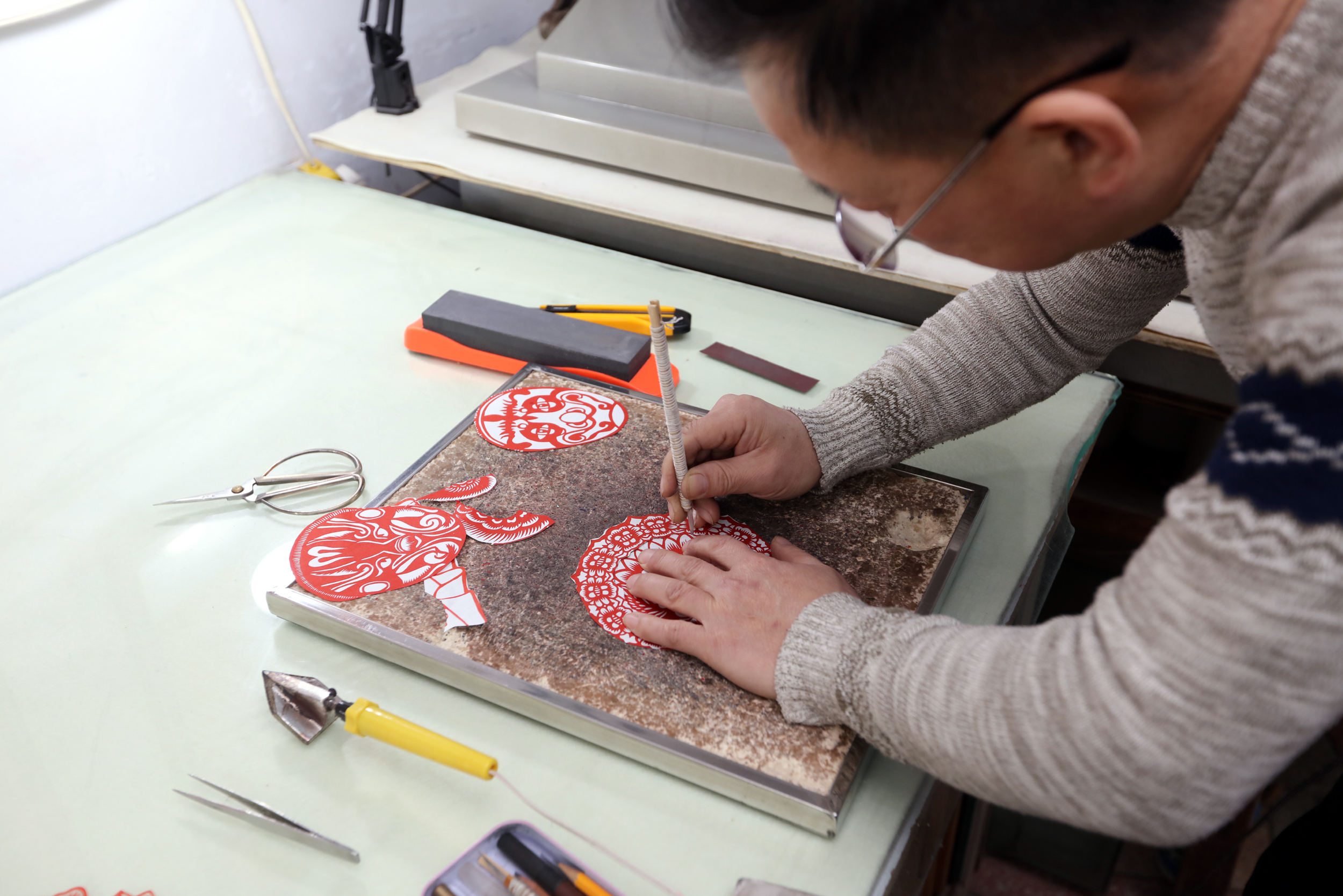 剪纸艺术家秘亚青正在创作剪纸作品。