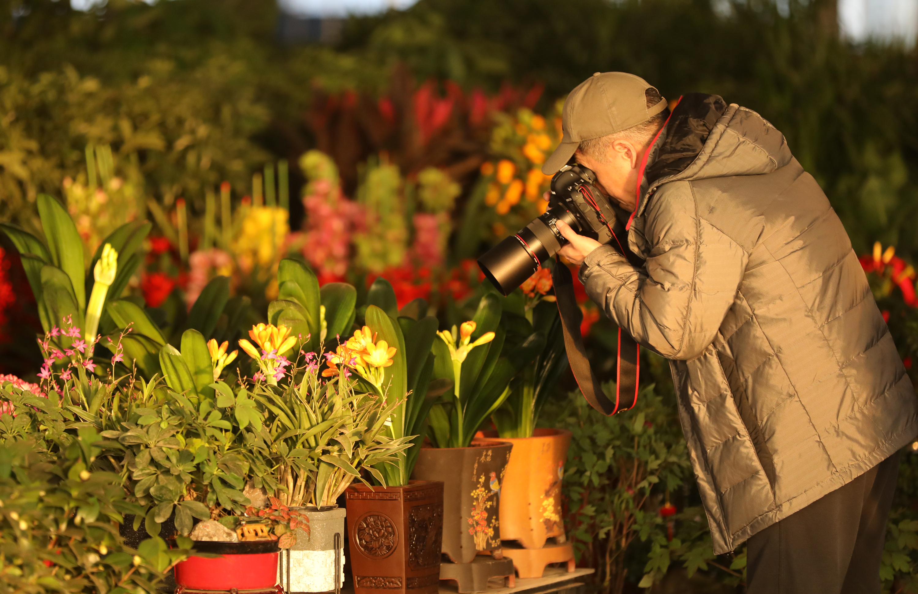 市民在市区花卉市场内的鲜花前驻足观赏。