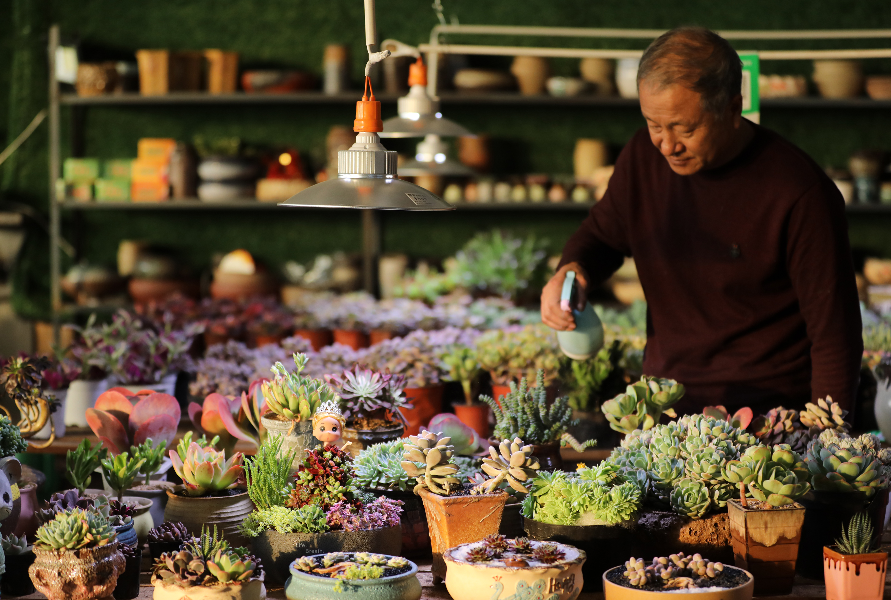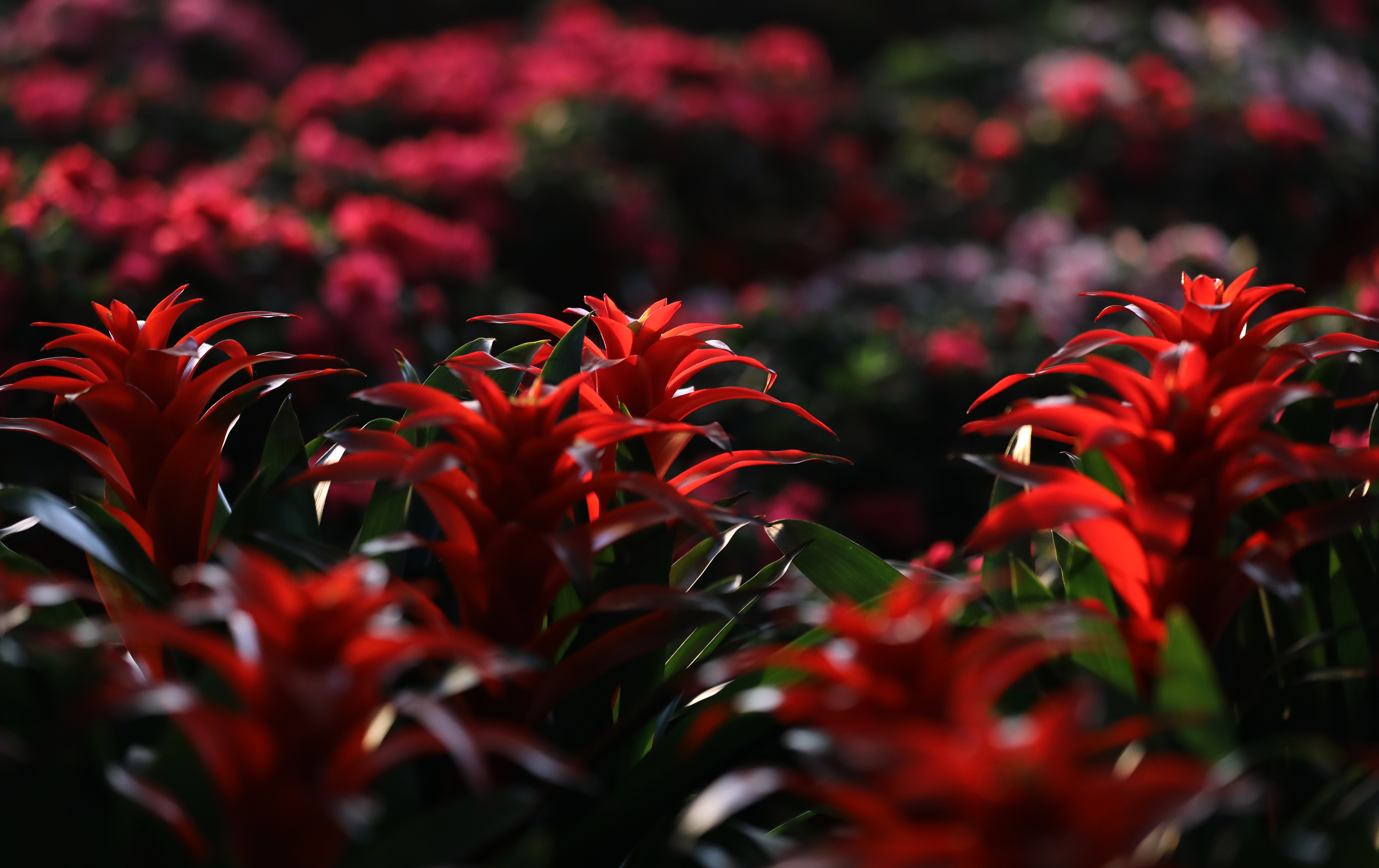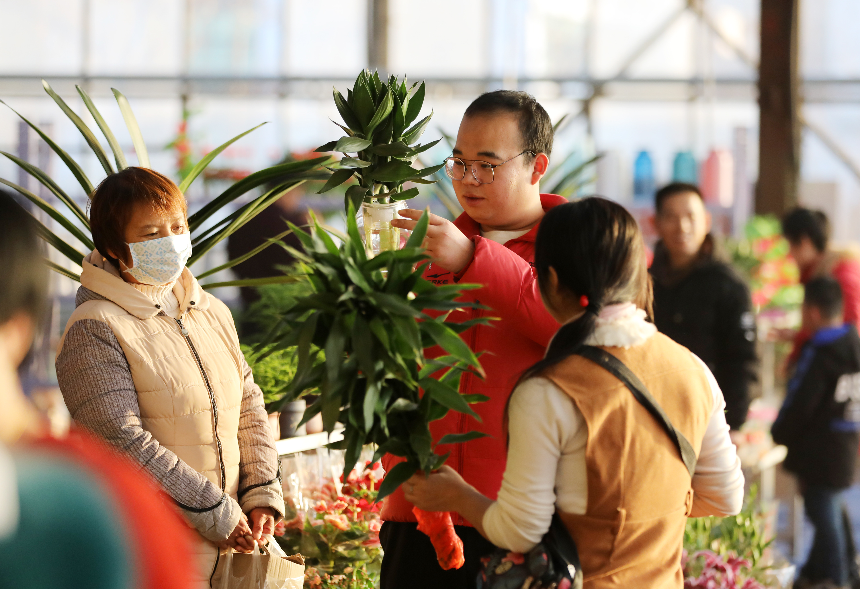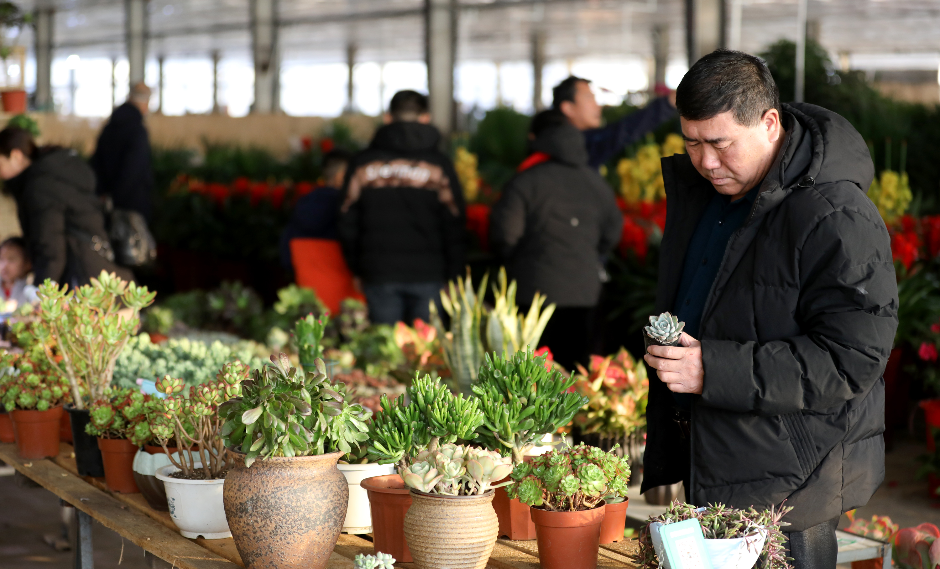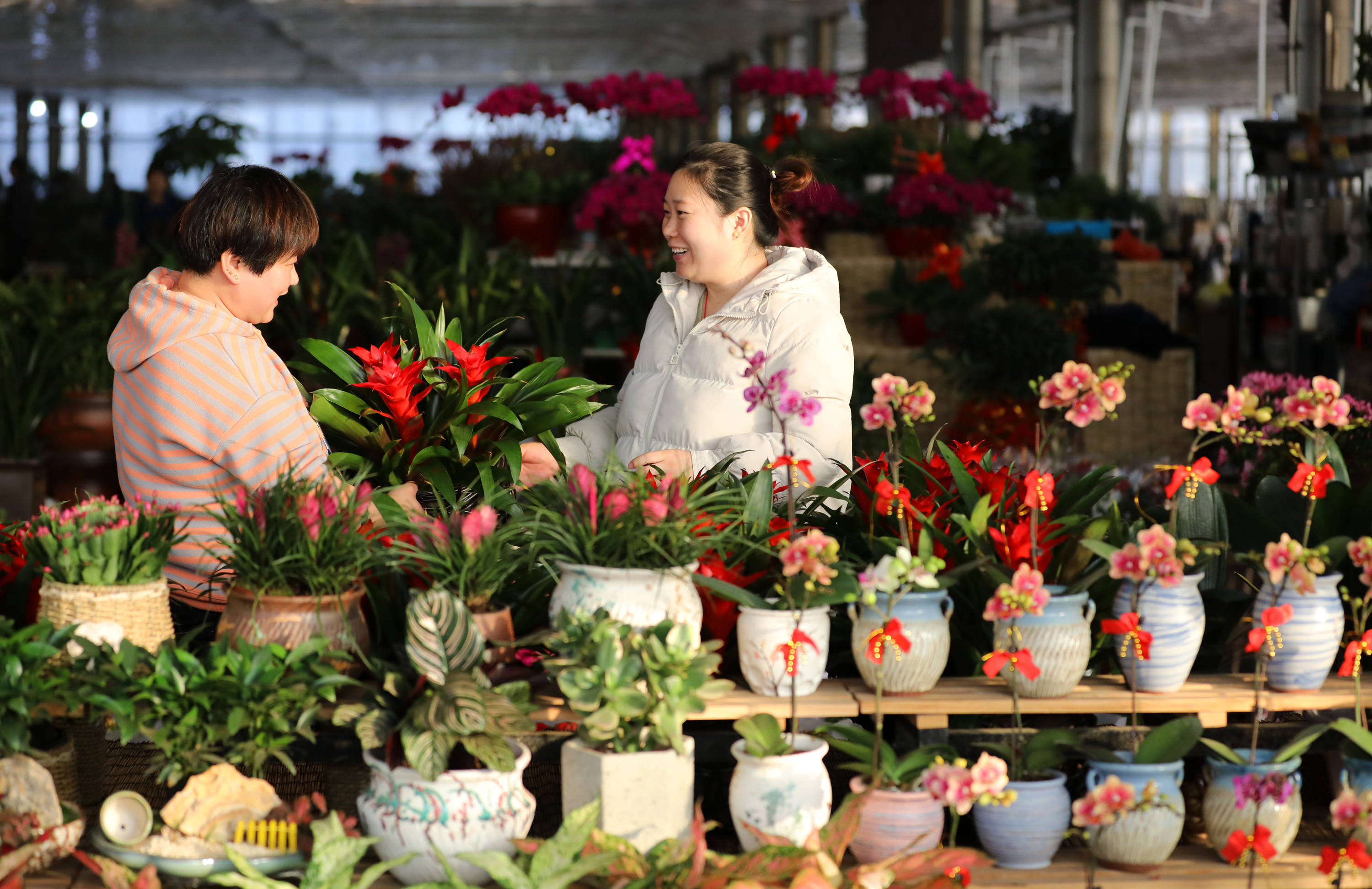 市区花卉市场内,各式各样的花卉竞相开放,吸引了前来参观的顾客。