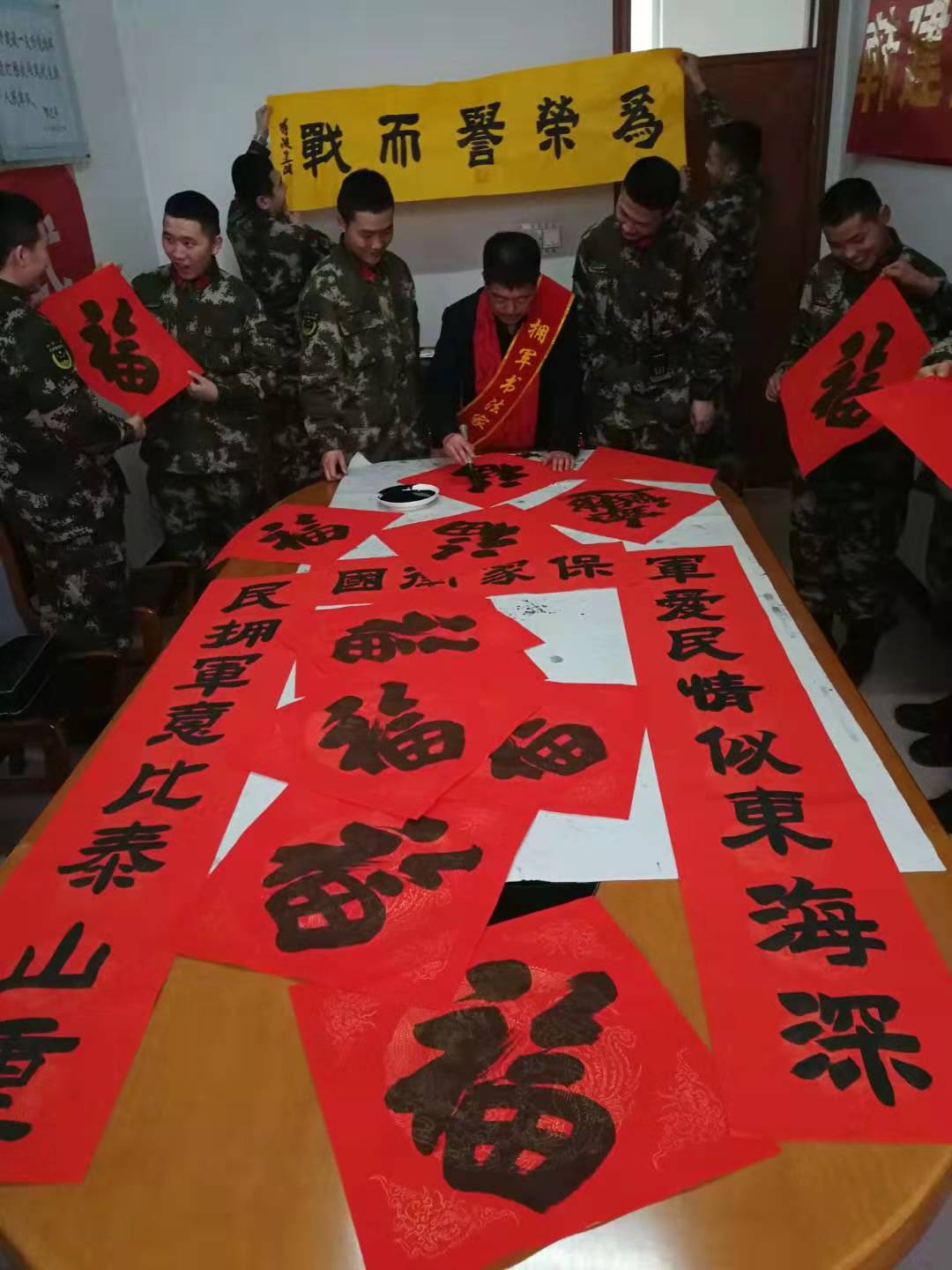 “一人当兵固国防,全家光荣享安康。”“军爱民情似东海深,民拥军意比泰山重。”……当天,在新兵杜思尧和西关村新兵王泽嘉家,安平县人武部邀请书法家现场挥毫献宝,红红的春联、浓厚的墨香,一幅幅充满喜庆、吉祥、祝福的春联和书法作品在他们手中随笔而出。人武部有关负责人还向军属通报了新兵在军营的成长进步情况和建功军营的事迹。军属们表示非常支持子女从军,希望孩子能踏踏实实在军队服役,尽好保家卫国的责任。