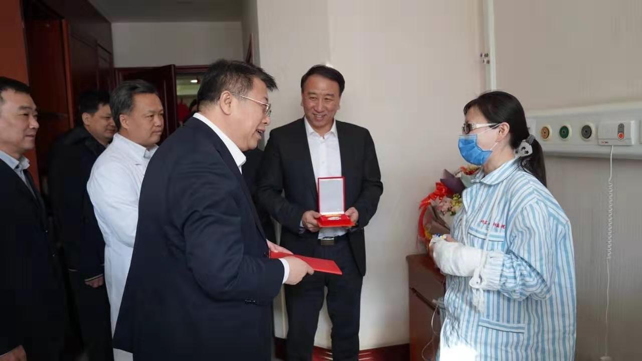 今天中午,北京市委社会工委书记、市民政局局长李万钧,朝阳区委书记王灏,市卫生健康委副主任李彦梅等领导专程到医院看望了朝阳医院伤医事件中的见义勇为人员田宇、杨硕同志,并现场颁发北京市见义勇为人员奖章、证书和奖金。