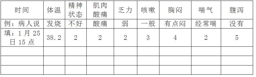 除了体温,其他的填数字1~5,1是感觉受不了,非常难受或者非常差,5是完全好转。如果都是5,那就好了,如果和之前比很多数字变小了,或是某一项到1了,就要赶紧联系医生了。