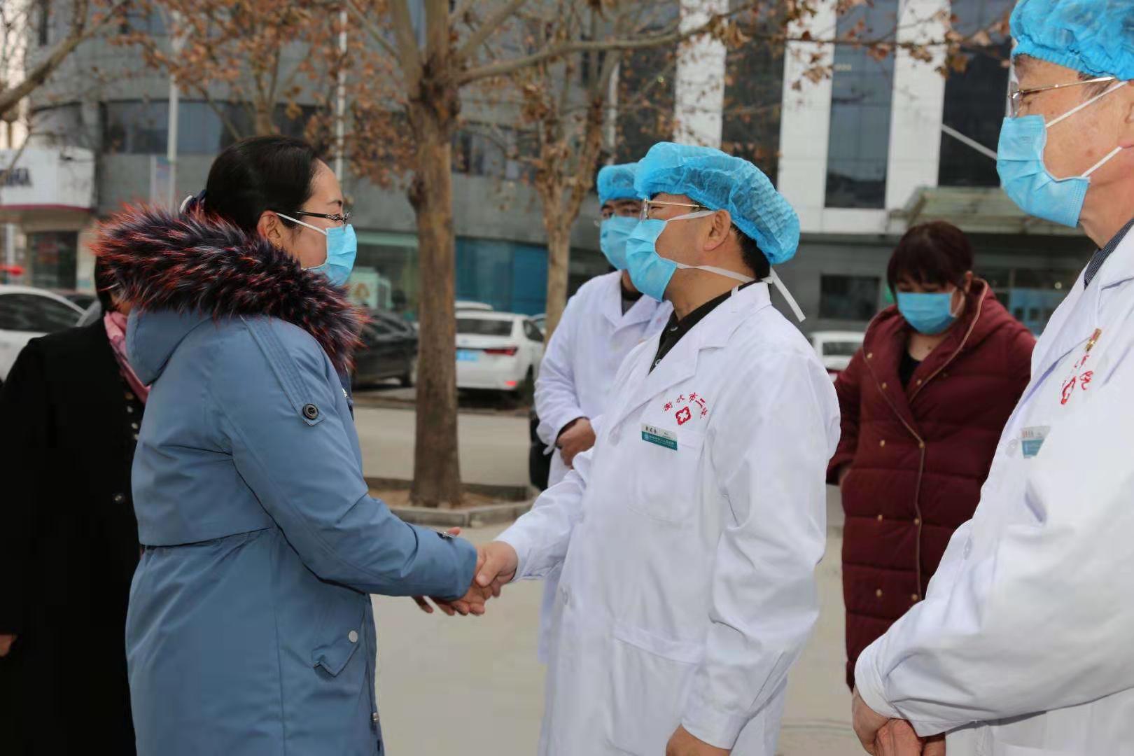 在送行出征队员时,医院为队员准备了各种防护物资。院长梁君奎动情地说“尽管衡水防控形势很严峻,但湖北更需要你们!医院为拥有优秀的你们而感到无比骄傲,你们既是医院的牵挂,也是亲人的思念,一定要做好防护,医院同你们站在一起,是你们的坚强后盾!同时希望你们在前线展现出衡水二院人能战斗、能吃苦的精神,凯旋归来!”