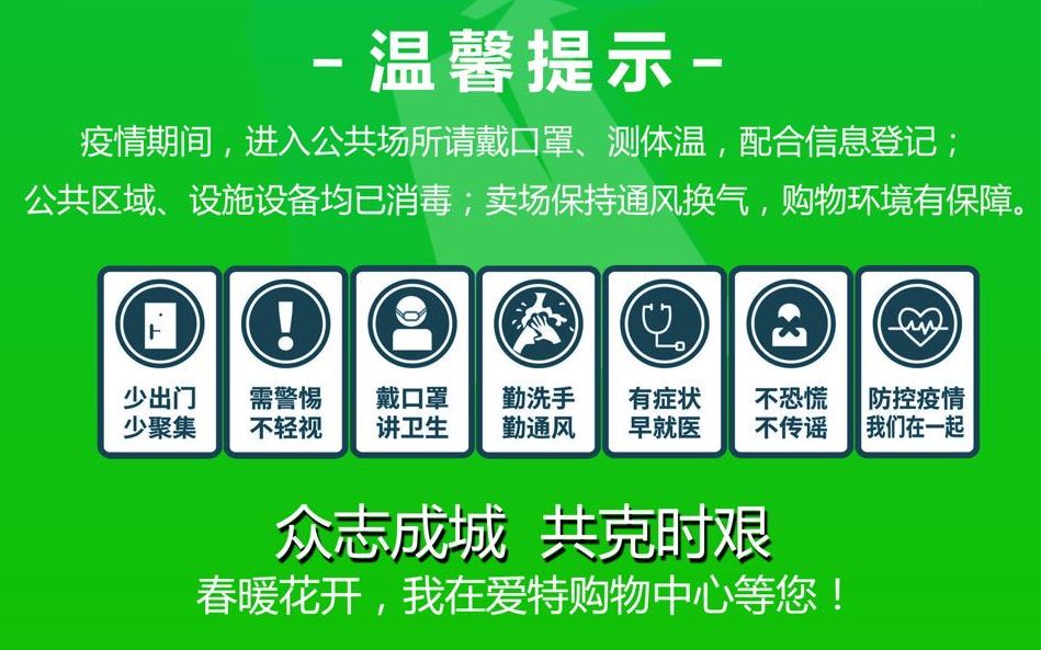 近日,衡水爱特购物中心在严格按照衡水市《商贸流通服务企业复市营业疫情防控实施方案》全面做好疫情防控及复市营业前期一切准备工作之后,决定于2月27日恢复正常营业。