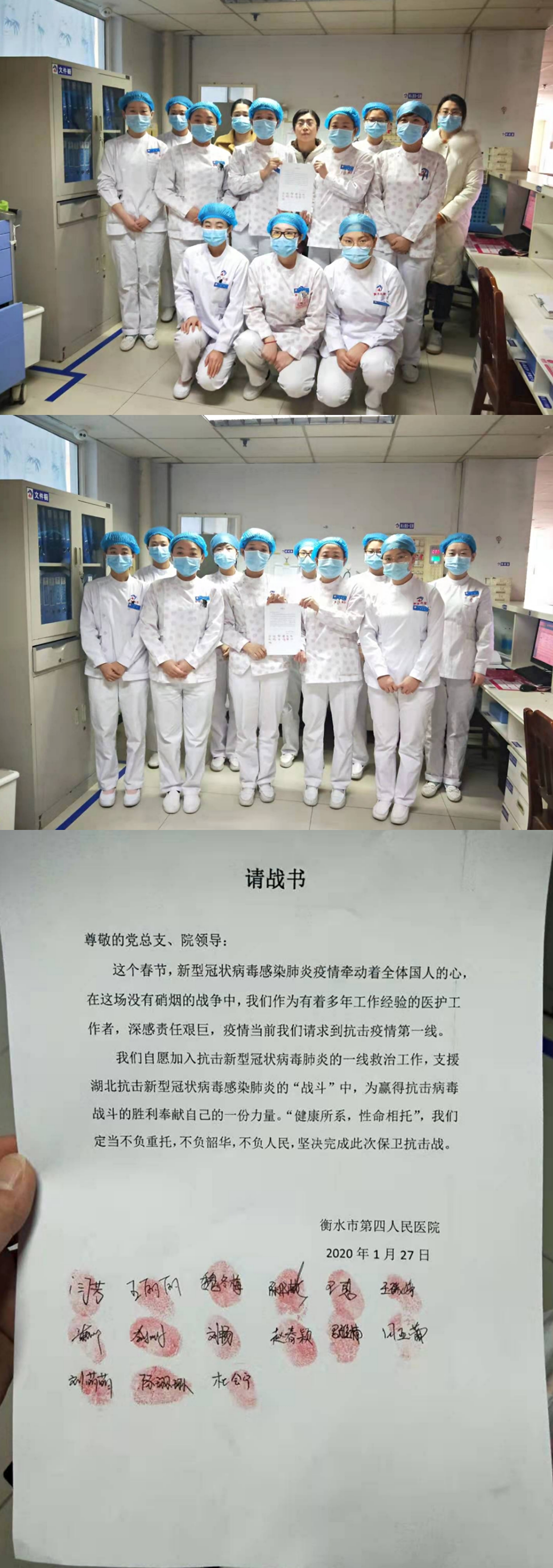 衡水市第四人民医院向全院党员干部职工发出了“到祖国最需要的地方去”的号召。瞬间,一张张摁着红手印、写满名字的“请战书”,像雪花一样,在这个寒冷的冬季飞舞而来……