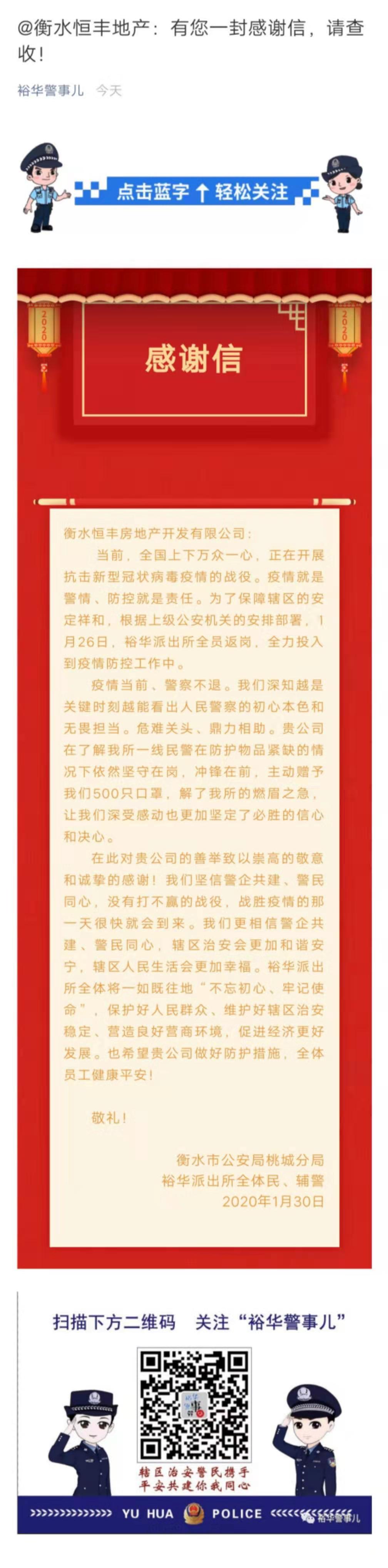 1月30日,衡水市公安局桃城分局裕华派出所通过其微信公众号“裕华警事儿”给衡水恒丰地产“寄”出了一封感谢信,感谢其紧要时刻送来500只口罩,给一线民警使用。