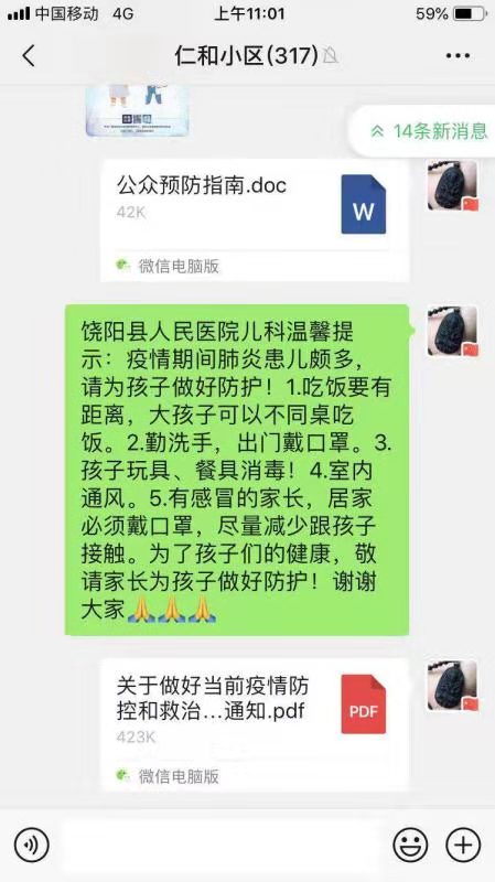 “饶阳县城区防控工作通知”“公众预防指南”“饶阳县人民医院儿科温馨提示”……2月2日上午,一条条信息从饶阳县各小区建立起的微信群中散播开,家住阳光花园小区的业主张先生说:“通过小区的微信群,不仅能了解到最新的疫情状况,也能了解到县里防疫的最新工作进展,真是太方便了。”