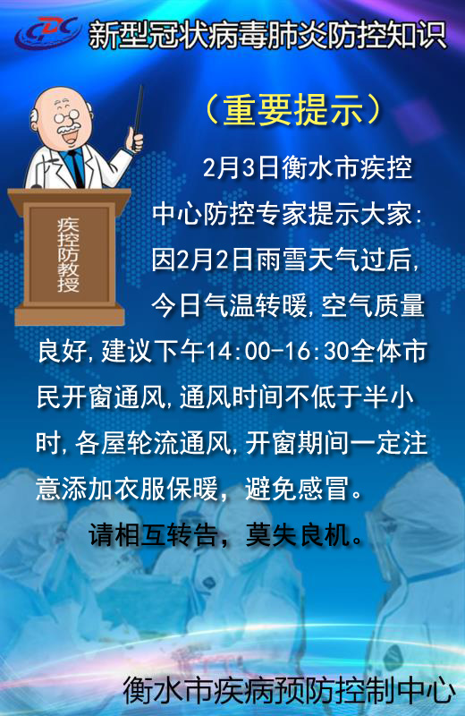 2月3日,衡水市疾控中心防控专家提示广大市民:因2月2日雨雪天气过后,今日气温转暖,空气质量良好,建议下午14:00—16:30全体市民开窗通风,通风时间不低于半小时,各屋轮流通风,开窗期间一定注意添加衣服保暖,避免感冒。