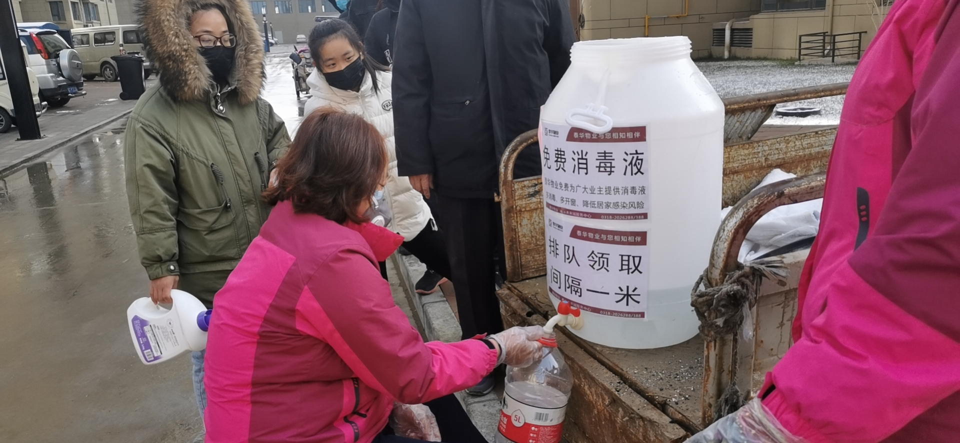 孙三村为小区居民免费提供消毒液。