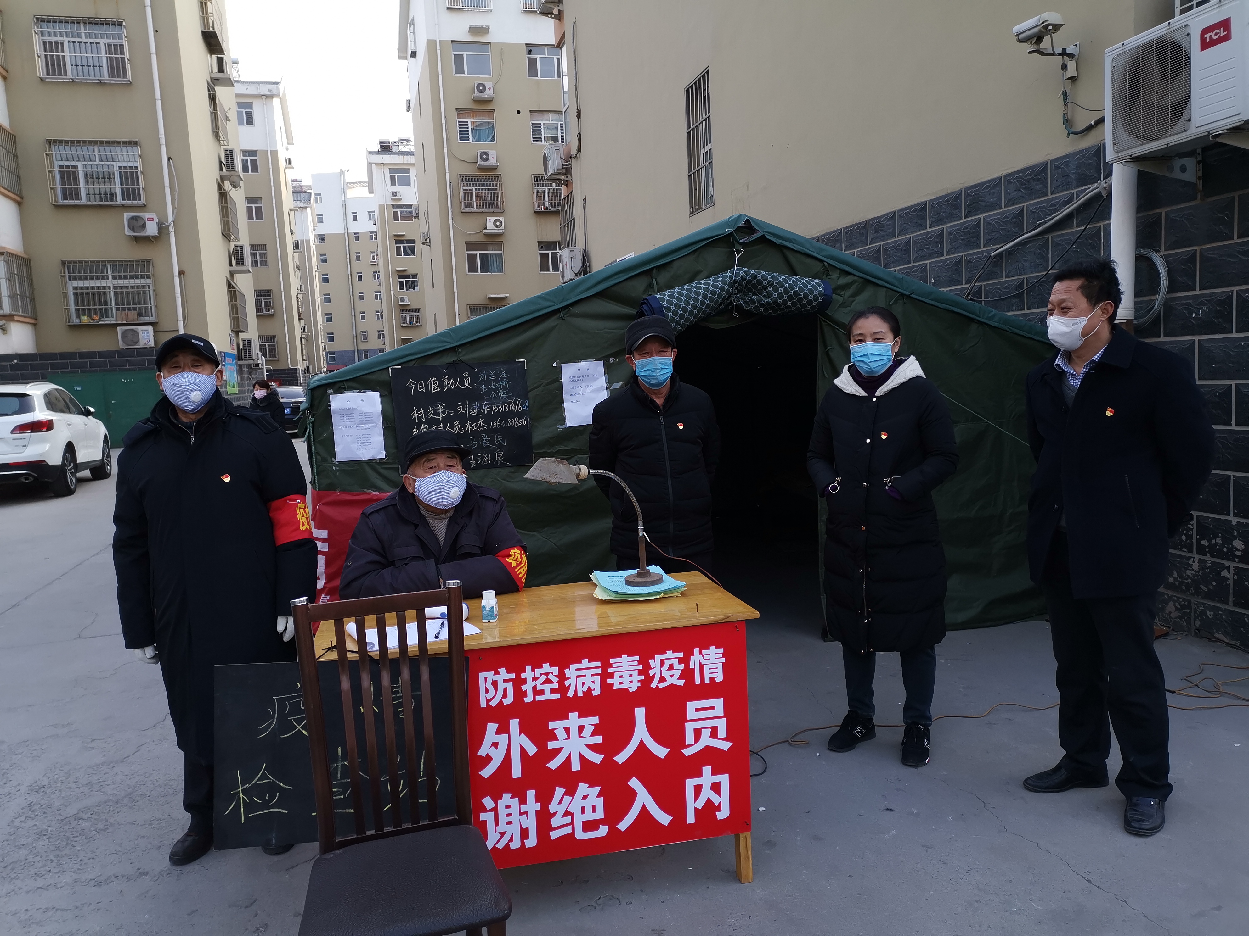 刘里马村村干部在回迁小区检查岗执勤。