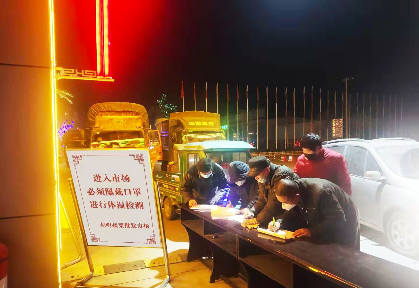 东明蔬菜果品批发市场对商户进行体温检测、登记