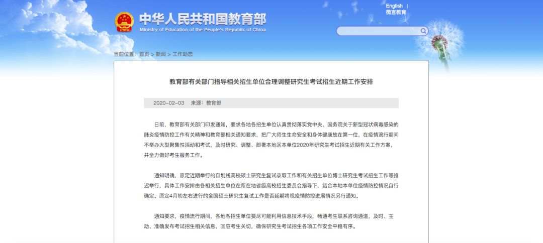 日前,教育部有关部门印发通知,要求各地各招生单位在疫情流行期间不举办大型聚集性活动和考试,及时研究、调整、部署本地区本单位2020年研究生考试招生近期有关工作方案,并全力做好考生服务工作。