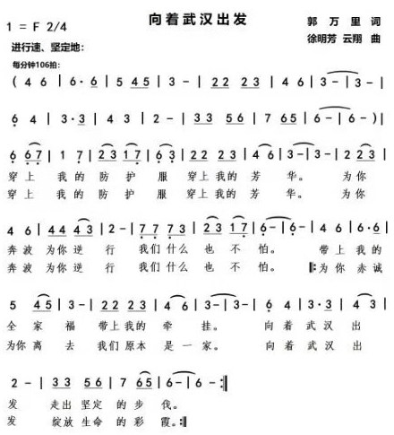 “穿上我的防护服,穿上我的芳华。为你奔波,为你逆行,我们什么都不怕。……”3日,由我市词作家郭万里作词、北京作曲家李云翔和徐明芳谱曲、黄智远演唱的原创歌曲《向着武汉出发》正式上线。该歌曲时长约2分钟,听起来旋律激昂、令人振奋,朴实的歌词更是引人泪目。