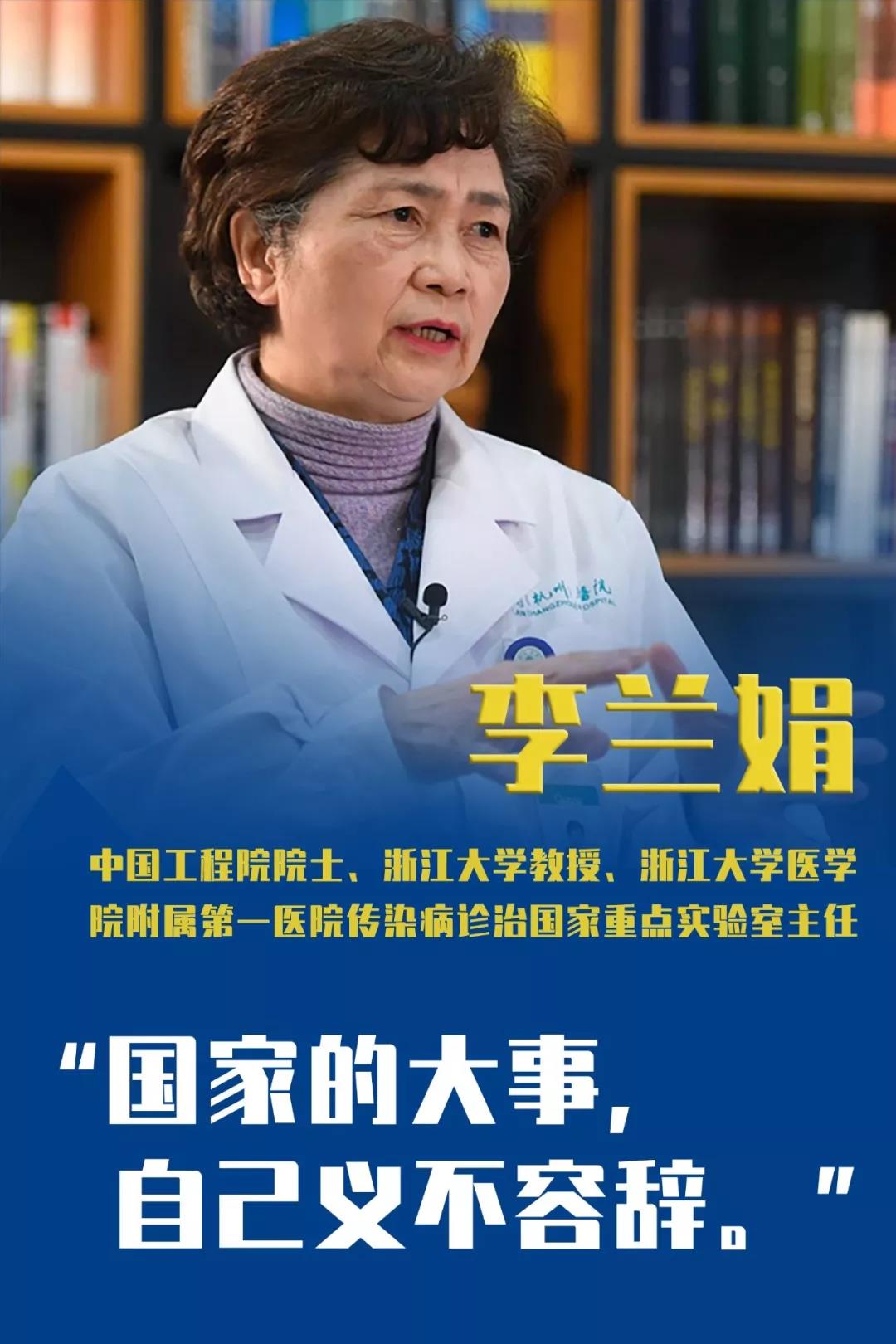 李兰娟是中国工程院院士,也是浙江大学教授、浙江大学医学院附属第一医院传染病诊治国家重点实验室主任。2月1日,73岁的她再次扛起责任,率领紧急医疗队驰援武汉,把人工肝、“四抗二平衡”等治疗方法带到武汉。四点多下火车、吃过早餐就接着开会,在收治重症患者的定点医院不分昼夜地忘我工作,与医护人员共同商讨并制定治疗方案。她还向老百姓普及防疫常识。与病毒赛跑的李兰娟院士,甚至有时一天只睡三个小时。