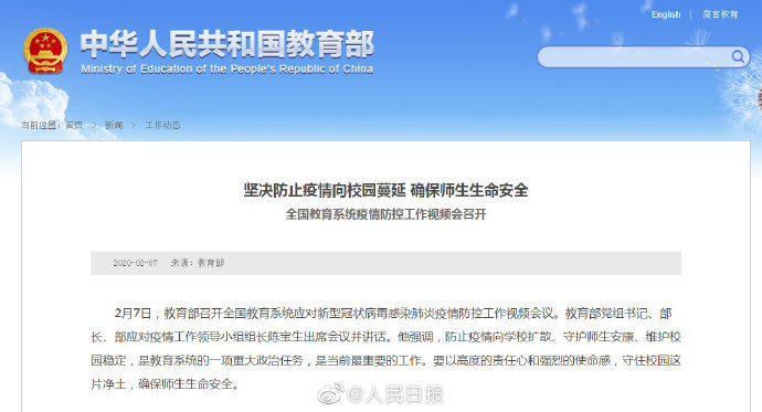 2月7日,教育部召开全国教育系统应对新型冠状病毒感染肺炎疫情防控工作视频会议。指出严格管控学校校门,未经学校批准学生一律不准返校,校外无关人员一律不准进校门,师生进入校门一律核验身份和检测体温,对发烧咳嗽者一律实行医学隔离观察,不服从管理者一律严肃处理。学生公寓封闭管理。