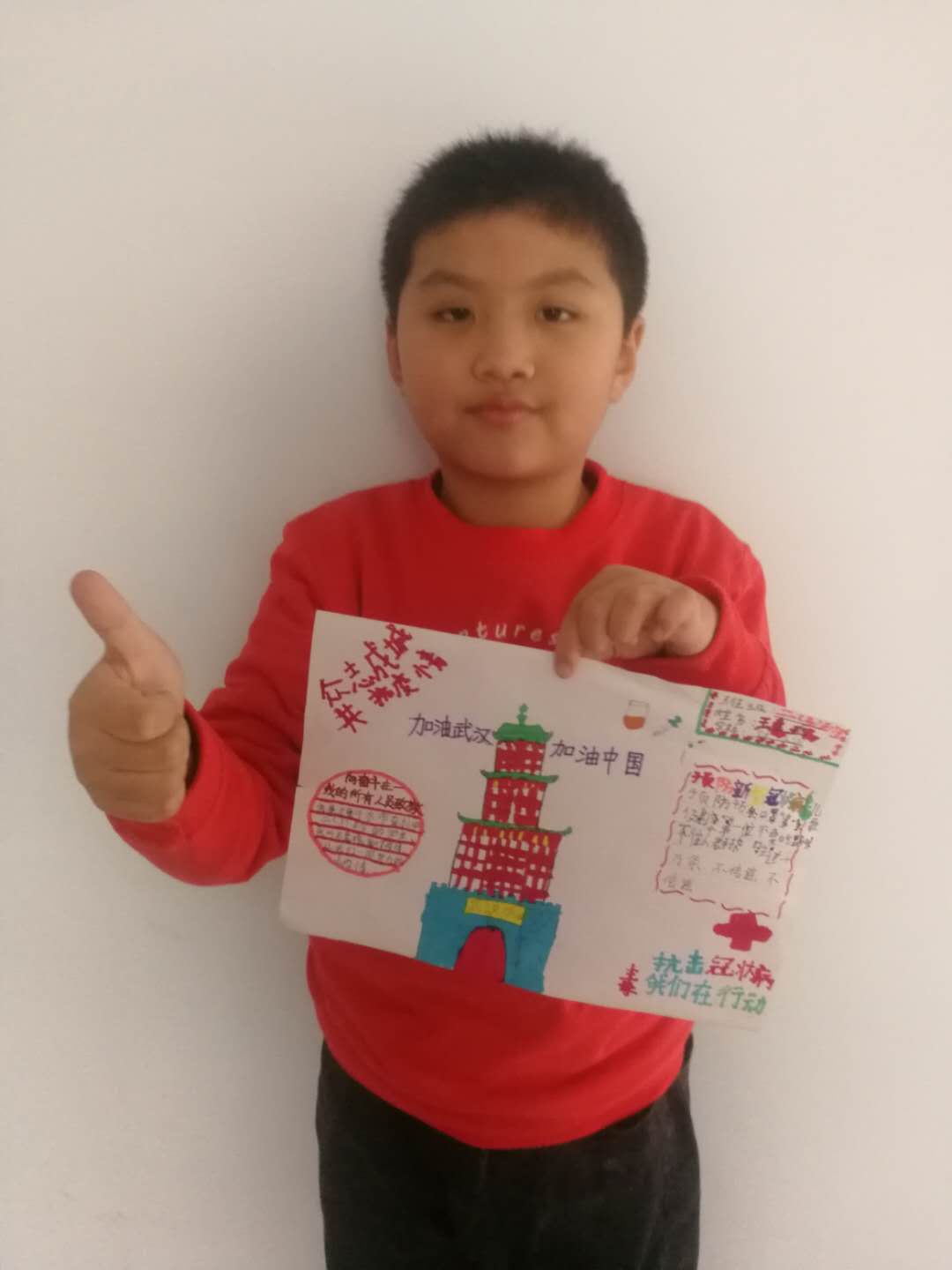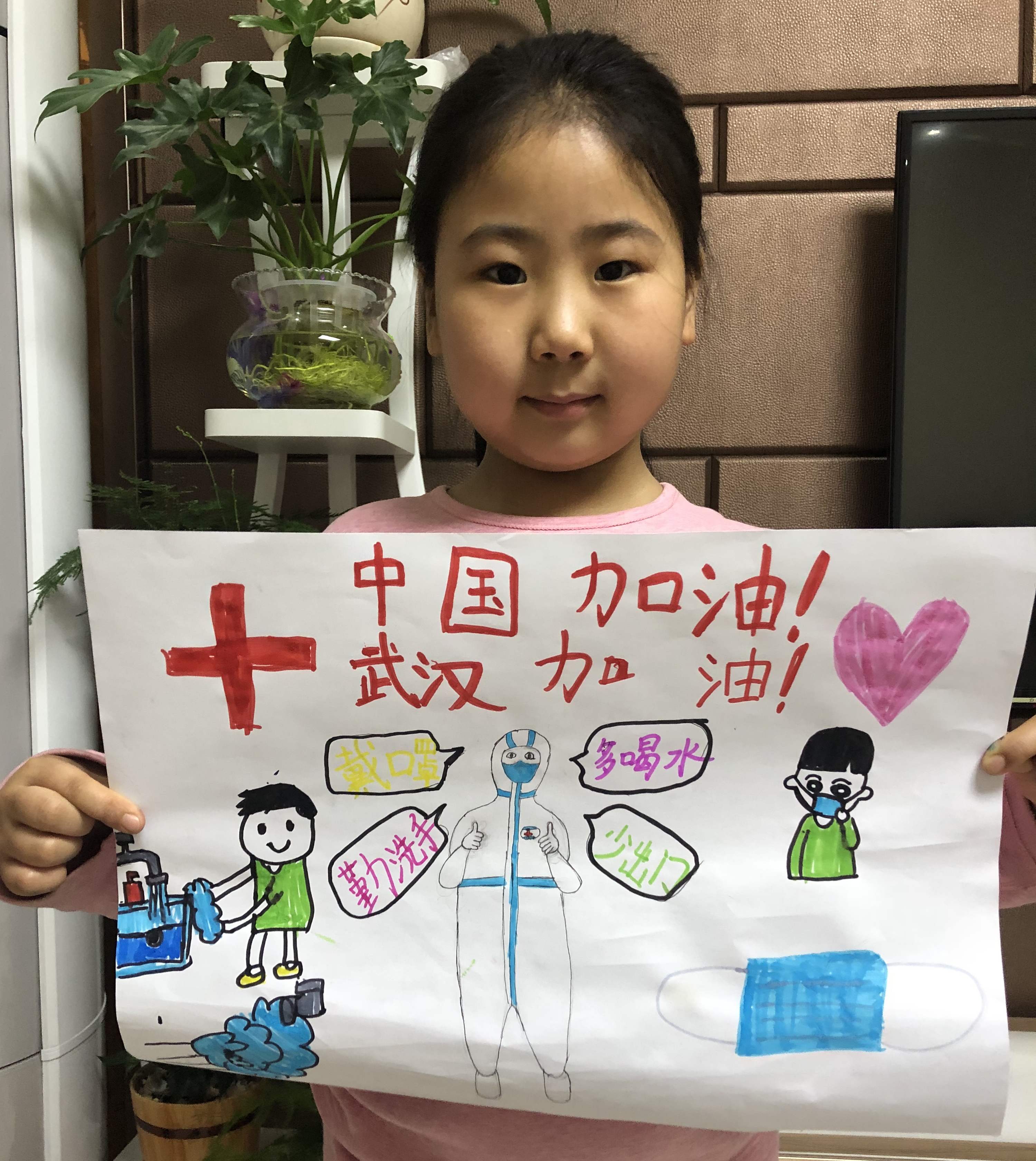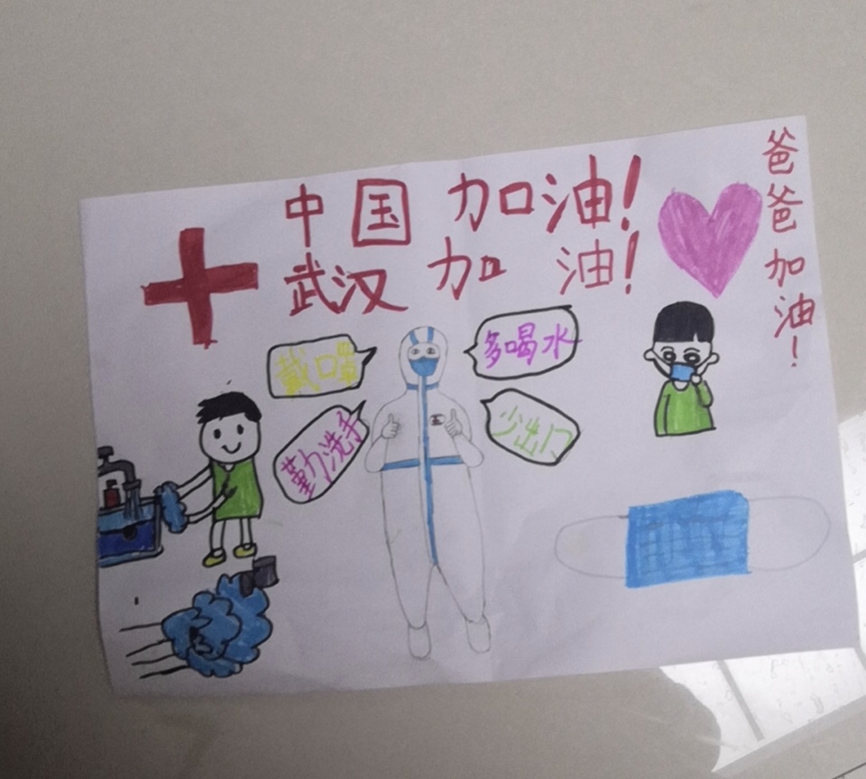 衡水市永兴路小学二年级的吴世腾以爸爸为原型创作了一幅画,画中穿着隔离服的医务人员就是吴建朝,她想对爸爸吴建朝说,“爸爸,加油!我等你平安归来!”