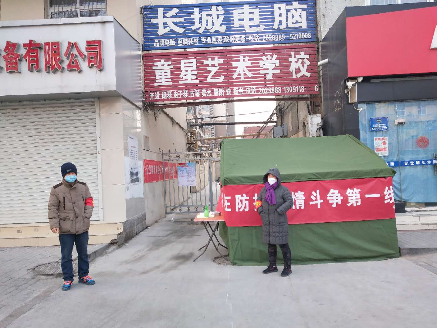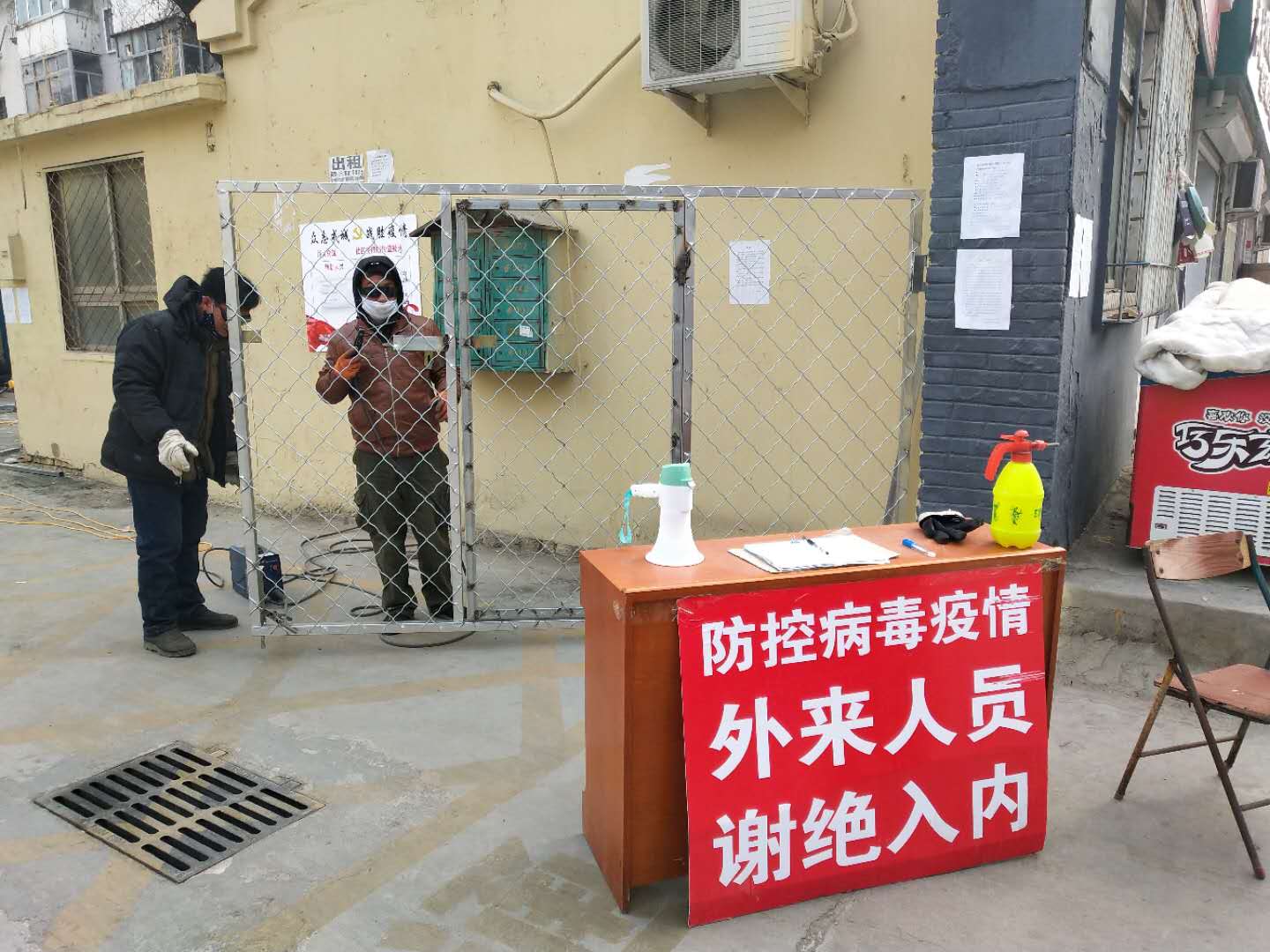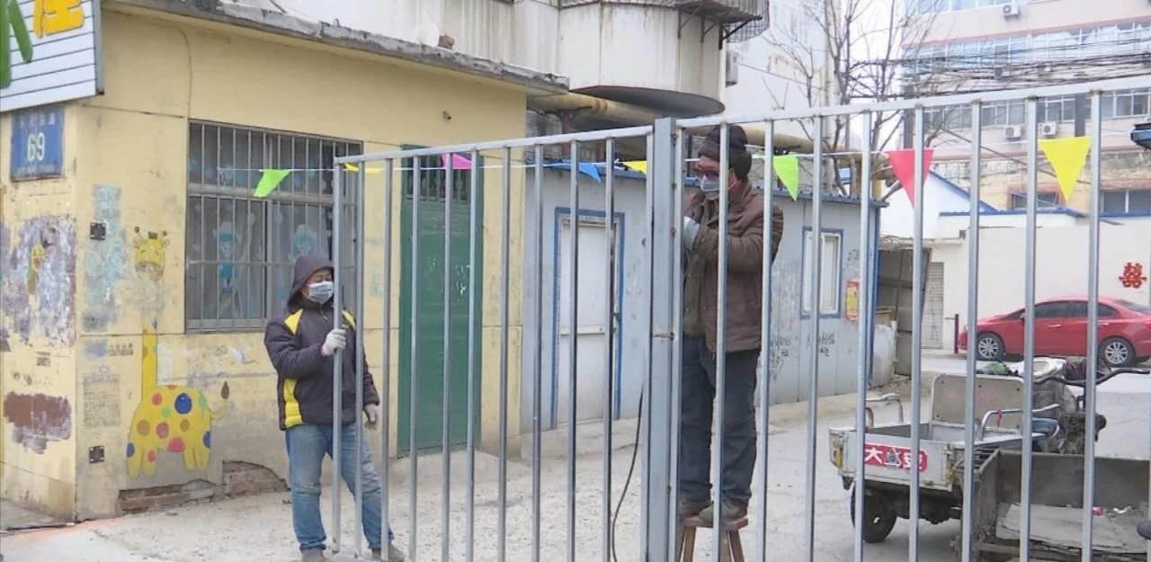 2月8日,路北街道办事处牛佐新村居委会主任马文婷带领记者来到二建生活区。该小区正在焊接、安装大铁门。小区联防联控队队长曹彦文、队员王新国和刘忠新身穿军绿大衣,正在值班。外卖、快递人员一律不让进入。路北办给联防联控队发放小喇叭,不停地广播各种防控知识。他们除了24小时在小区门口值班,还安排专人每天定时喷洒消毒药剂。疫情发生后,路北办立即派人检查各小区有何防控隐患,发现26个小区有铁门,其中7个小区铁门破损,对破损铁门进行了维修;发现60个小区没有铁门,马上购买物资,安排人员安装了铁门。目前,全部小区实现封闭式管理。