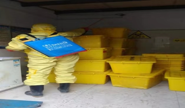 医疗废物从医院的医废处置间到达医废处置单位,需要经过三次消毒过程。首先是到达医院的专用医疗废物贮存间后,在装车前先对暂存的医疗废物进行消毒杀菌。第二是车辆在离开医院前和进入处置公司前都要进行车辆外部整体消毒。第三是医疗废物到达处置厂后,在卸车前对医废进行再次消毒,完成这一步消毒后开始卸货,直接卸平板车上,方便车间内转运。