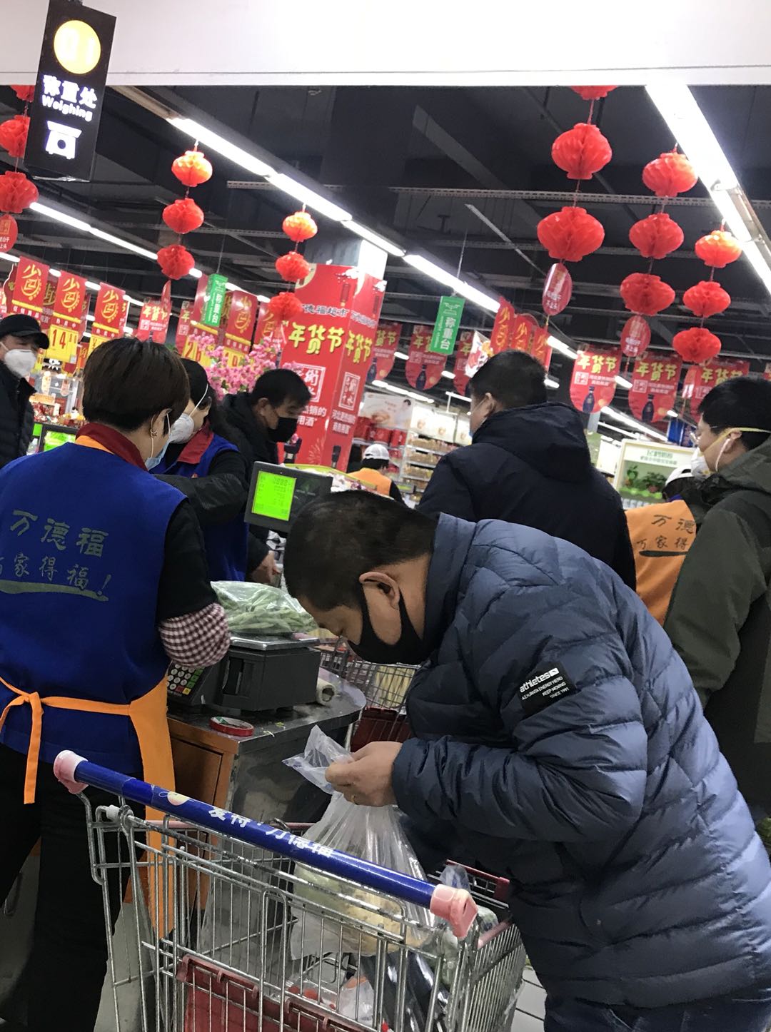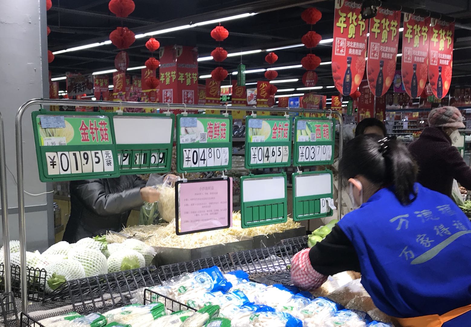 记者走进万德福超市,发现在休闲零食、衣服等区域购物的人员寥寥无几,而在蔬菜、水果和肉类摊位前则排起了队。在蔬菜区, 白菜、芹菜、黄瓜、青椒等新鲜蔬菜整齐地摆放在货架上,胡萝卜、甘蓝、白萝卜、白菜每斤价格都不超过两元,因为价格相对便宜且易于存放,许多市民正在排队购买。猪、牛、羊、鸡、鱼等各种肉类供应充足。猪肉价格在36.9元/斤,价格相对上涨,但涨幅不大。“蔬菜水果种类多,也新鲜,没有必要囤货。”市民张明告诉记者,因为担心疫情,他基本三、四天到超市集中购买一次。
