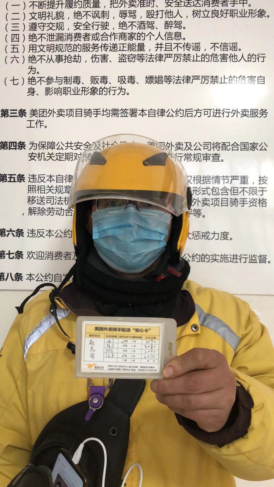 此外,玖快网络“美团外卖”平台针对此次疫情防控,在设立无接触配送取餐点的基础上,还要求骑手送餐全程佩戴口罩,每日早晚进行体温检测、上报骑手健康状况,随身佩戴健康安心卡,餐品入餐箱前对餐箱进行消毒、送完餐后餐箱再次消毒等措施,全方位确保消费者的用餐安全。