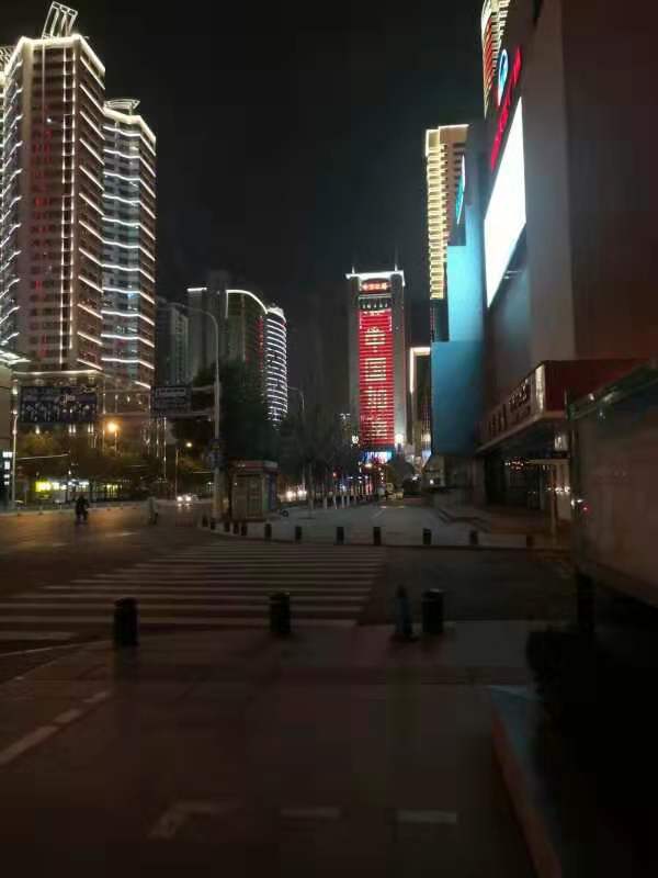 来到武汉第15天,阴有小雨,天空掉落的雨滴敲打着空旷的街道。