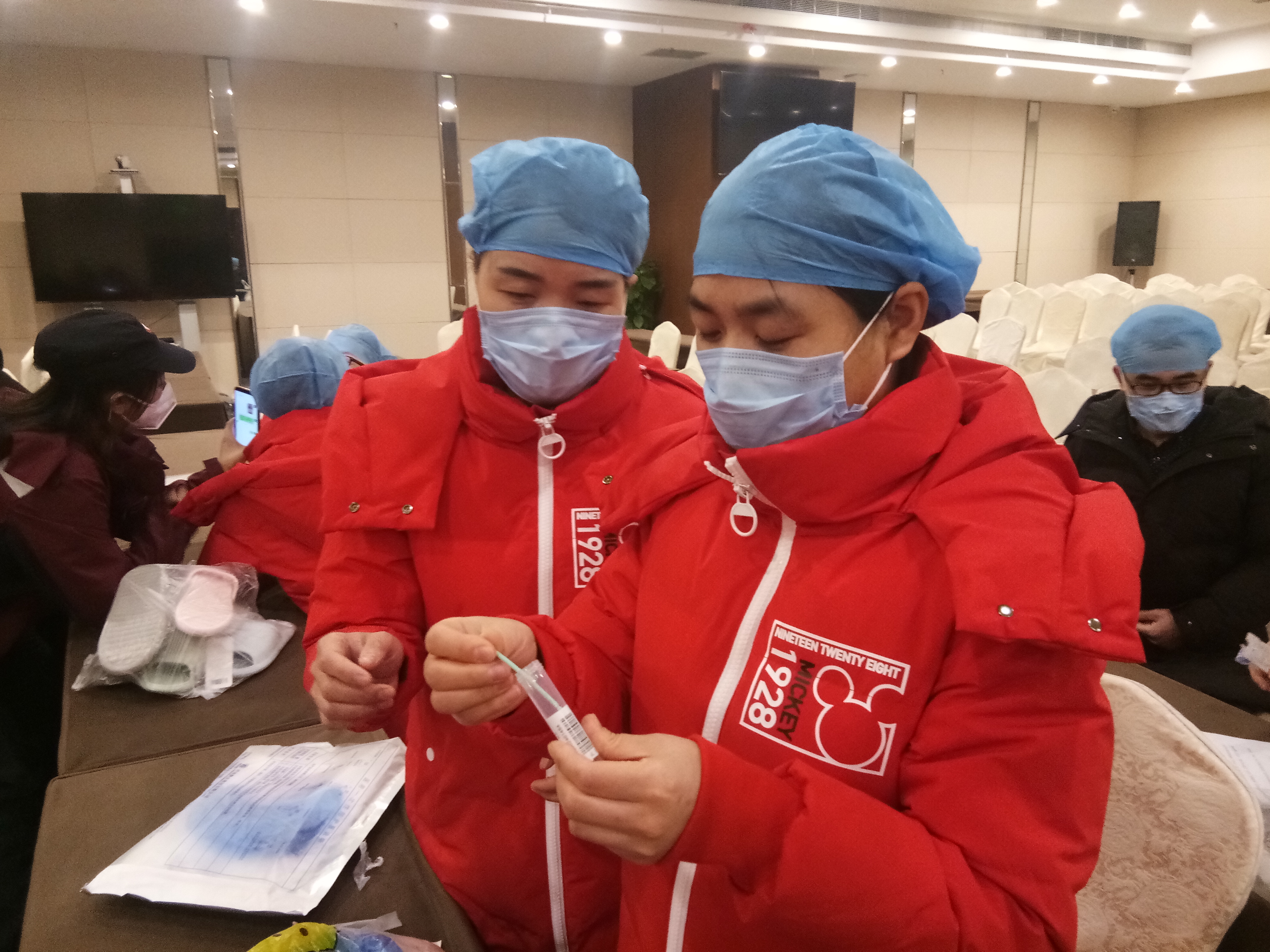 到达驻地后就是紧张的岗前培训,新冠病毒相关知识,正确掌握穿戴防用品、咽拭子标本采集、诊疗工作流程、患者心理安抚……我们需要掌握很多东西,每个人都很忙碌,甚至培训到晚上十二点才结束,结束之后我们还会继续练习到很晚。8号晚上,我们迎来了第一次入舱任务。