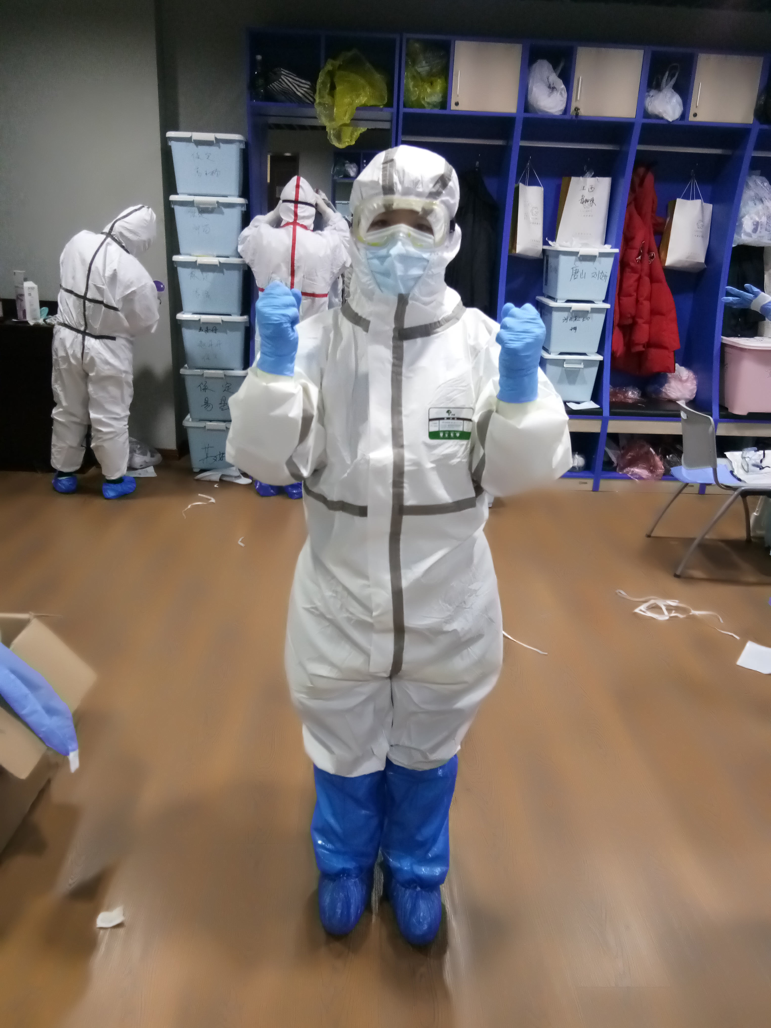 十分钟的车程转瞬即到,进了医院,小组长按人头领了防护用品,大家就各自忙碌为进舱整理好行装。两个人一组,互相监督穿防护装备,你穿一步,我盯一步,我做一步,你看一步,处处谨小慎微、步步遵守规范,精细到一个口罩,戴的时候手摸哪,先戴哪侧带,再戴哪侧带,放到什么位置……,口罩、帽子、手套都是双层,细节决定成败,只有防护好自己才能更好的救治病人。穿好后在每个人衣服上写上单位和姓名,排成一队有序的依次进舱。一个人进第一道门后,需立即关门,到下一个门,下一个人默默的数十个数后再进、再关,必须始终保证有一道门关着的。